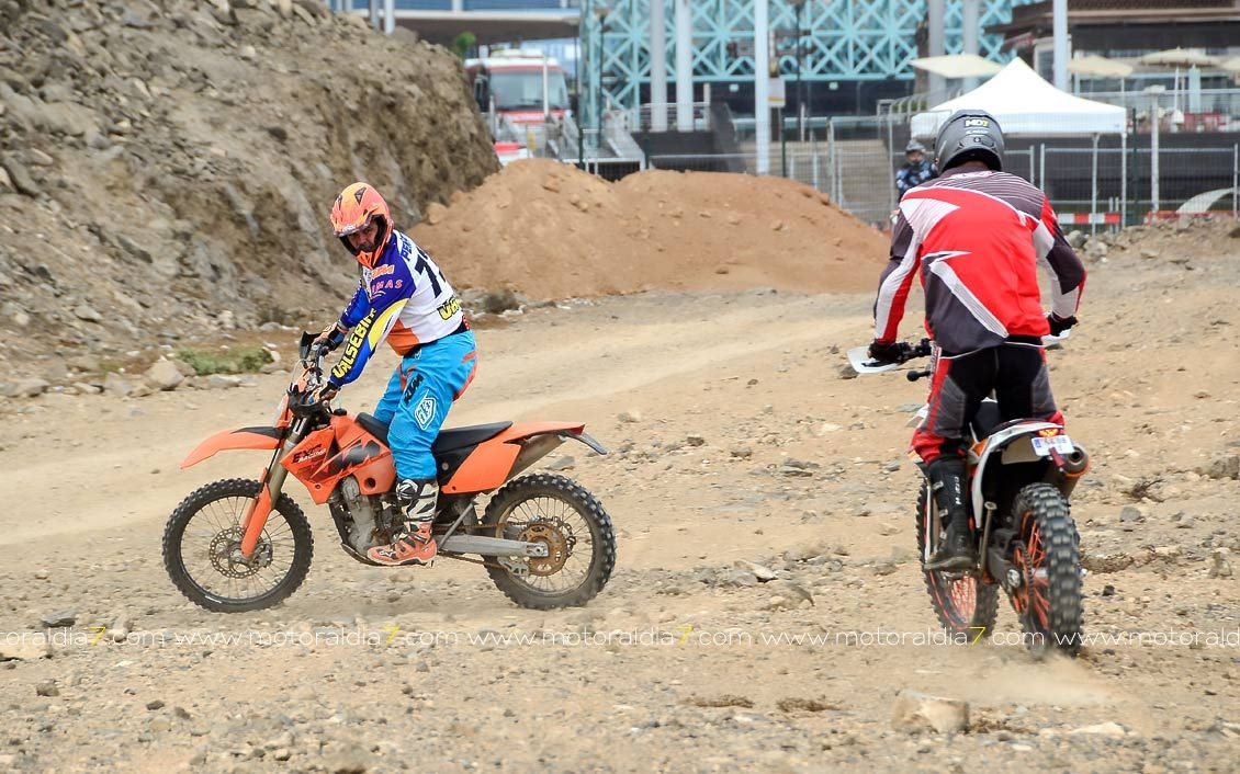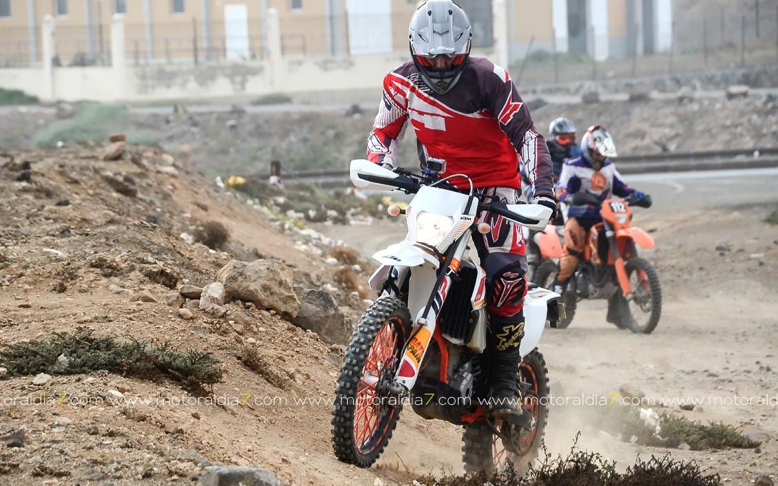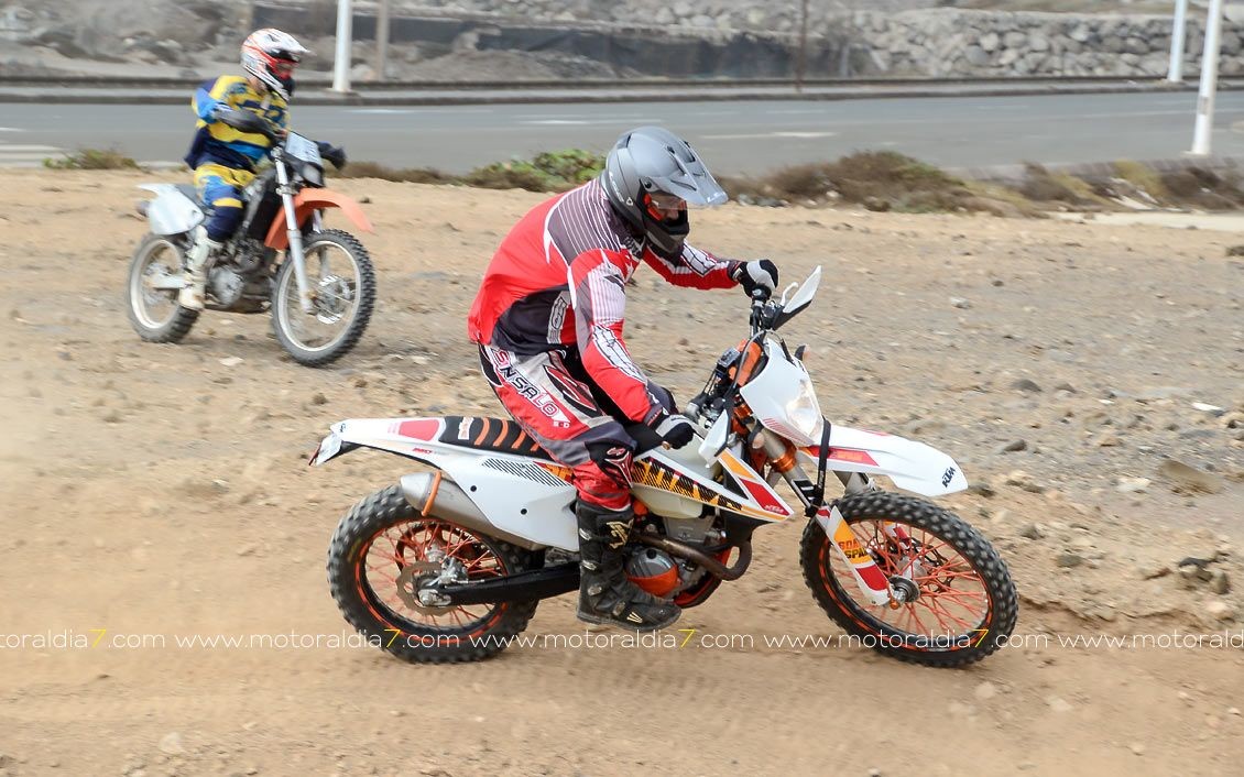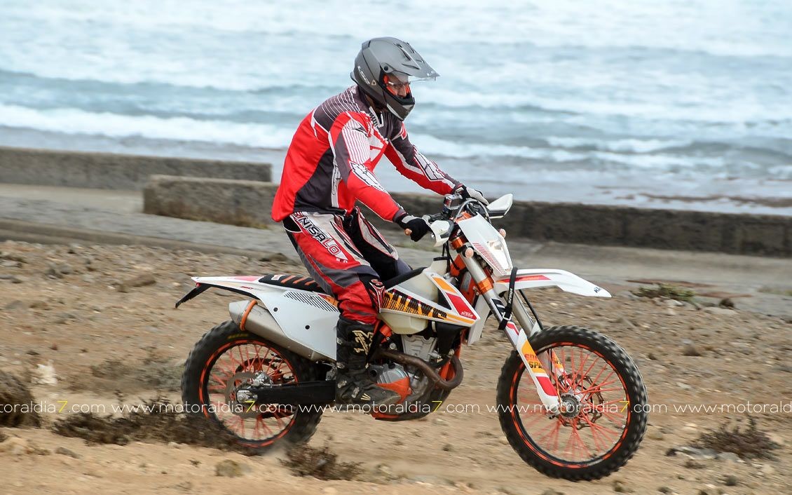 Después de unos cientos de metros, pasamos a la posición de pie (siempre guiados por Pedro Peñate, que vigila nuestras evoluciones). Ahora empieza lo bueno…..de pie sobre ella todo es más difícil, pero nos acordamos de los consejos que nos han dado antes de subirnos, y poco a poco vamos cogiendo confianza y llegando incluso a circular en tercera velocidad. Vamos lentos pero seguros. La KTM 350 Six Day no deja de sorprenderme, y lentamente ella y yo nos vamos haciendo uno. Sobre todo nos cuesta la tarea de subir y bajar marchas con unas botas de enduro que son la primera vez que las usamos, y a las que poco a poco nos vamos también acostumbrando.