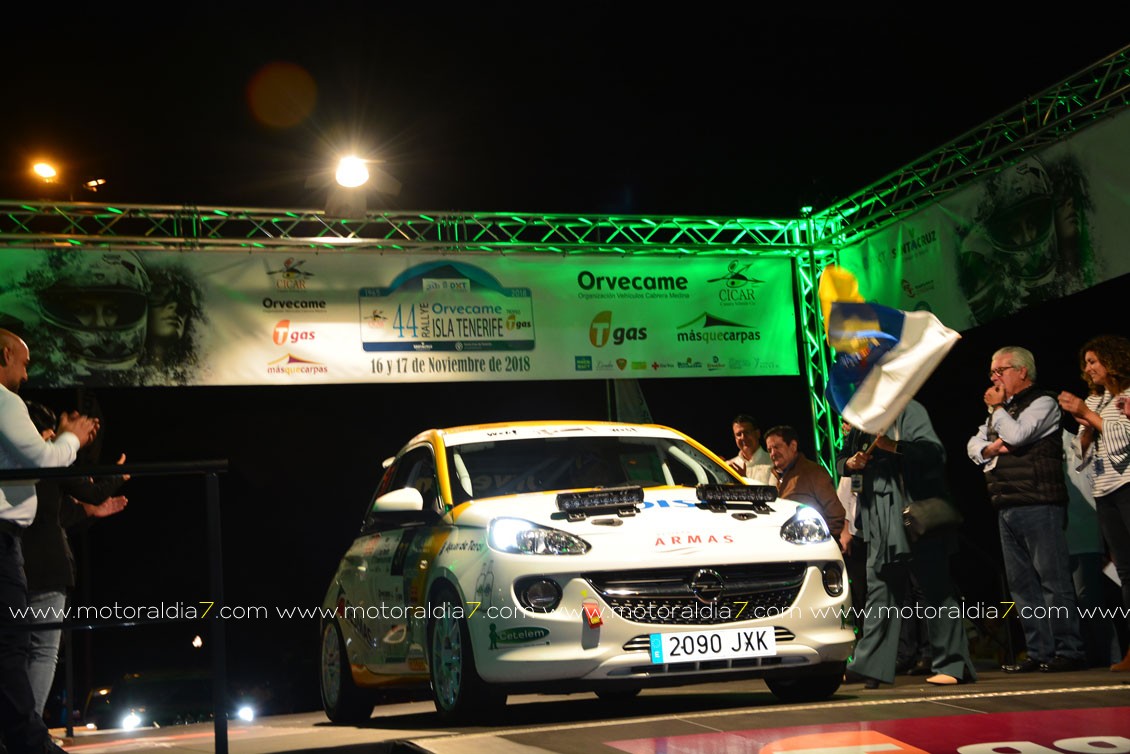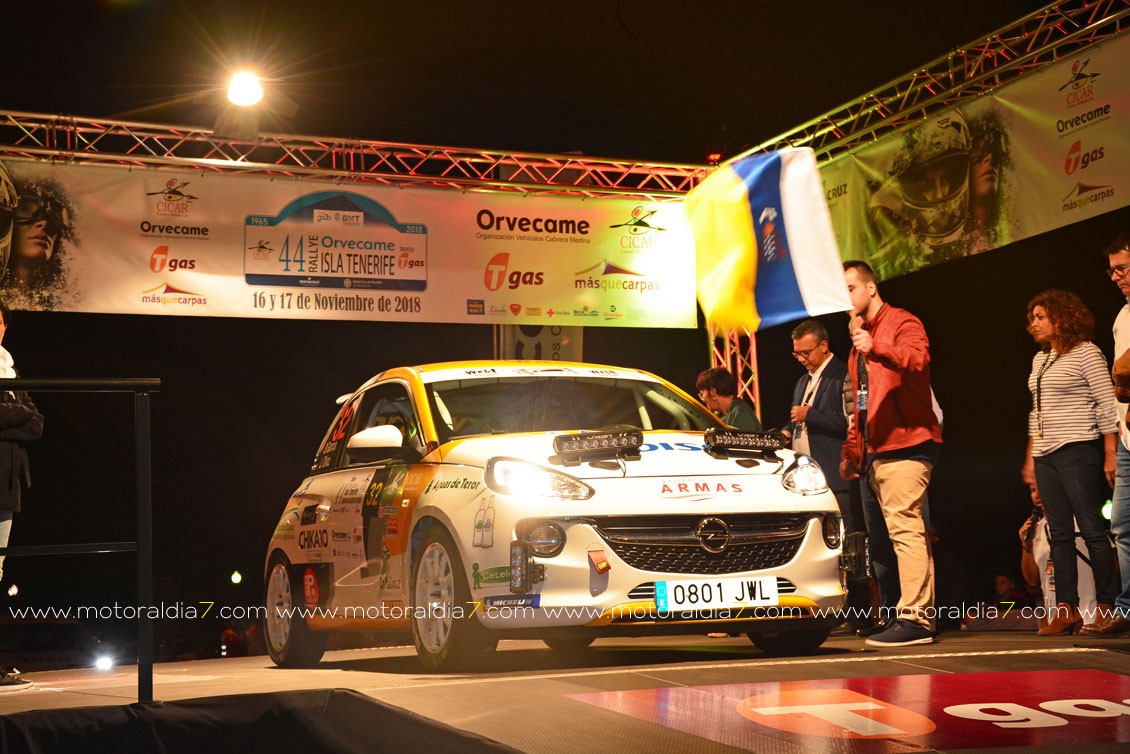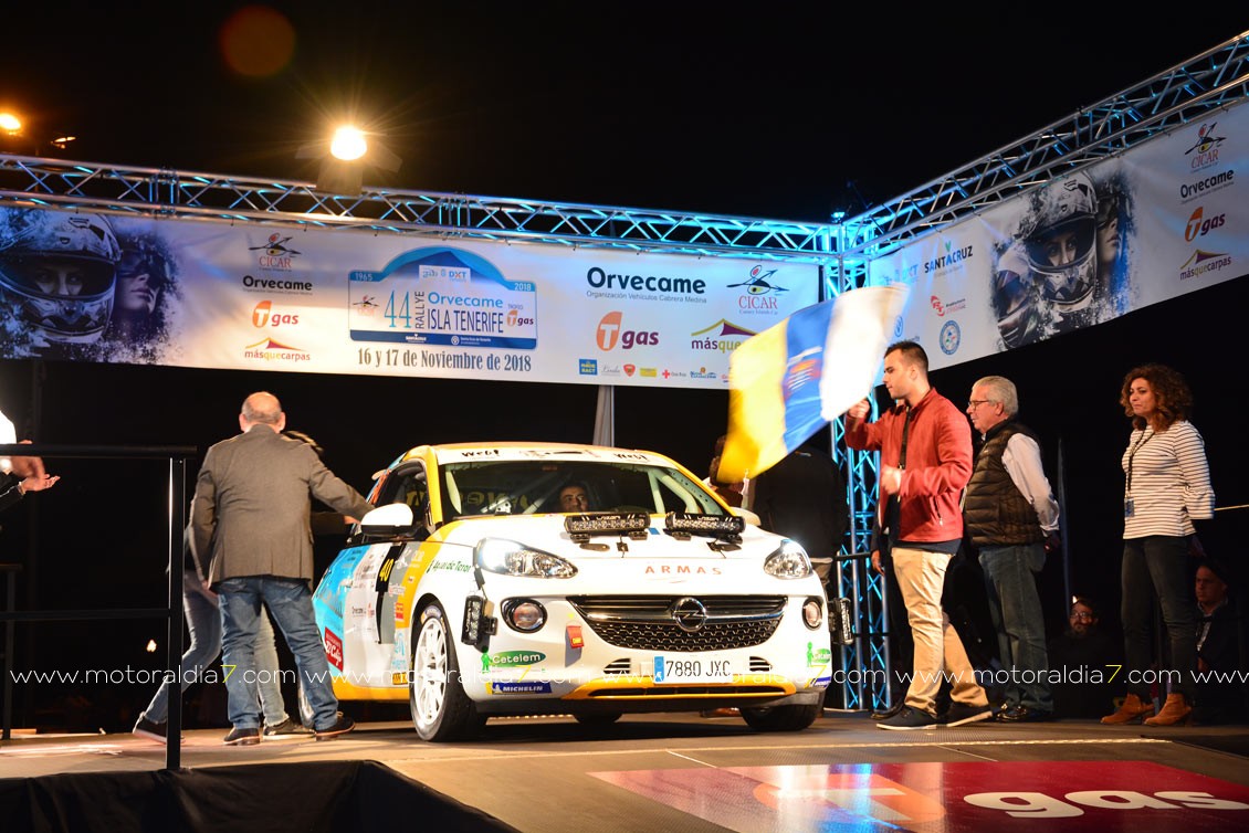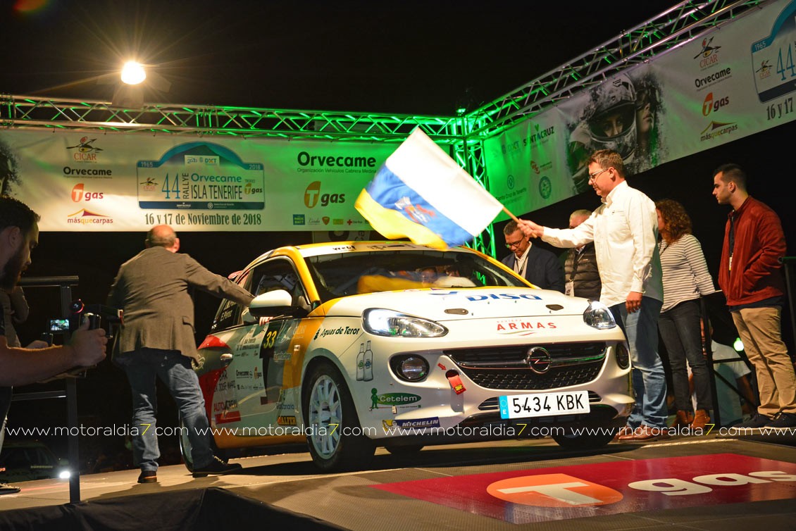 Desde la primera especial, el equipo de Enrique Cruz y Yeray Mújica con Porsche 997 se impusieron en el 44º Rally Orvecame Isla Tenerife Trofeo Tgas aunque por muy poca ventaja, terminado la etapa con una diferencia de 5.8 segundos sobre los segundos Lauren García y Néstor Gómez con Porsche 997. La noticia la marcaban Adrián García y Raquel Ruiz con el Peugeot 208 y una avería en el embrague que les relegaba a la décima posición de la clasificación a 2 minutos y 12 segundos de los primeros. El equipo decidió retirarse a la entrada del parque de trabajo. Terceros, y cerrando el podio provisional, José Mari Ponce y Carlos Larrodé con Seat JTR 600. La exigencia de la primera etapa deja fuera de carrera a 7 equipos más 9 equipos reenganchados al super rally.