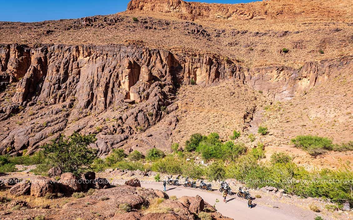 Mi siguiente preocupación era poder ubicar mi equipo fotográfico en la moto, para lo que Samir me montó un Baúl en la que podría transportarlo. Una pena que no cupiera mi mochila entera por lo que tendría que llevar mi cámara montada con el objetivo 24-120mm y suelto el 14-24mm, todo forrado con plástico de burbujas y acolchando bien el baúl para que no sufriera el equipo. El resto del equipo iría en el vehículo de apoyo y a buen recaudo en las manos de Jounes (un chico marroquí que siempre lleva la sonrisa puesta y parte del equipo de Moto Touring Maroc), que cada vez que llegábamos al final de la ruta se encargaba de entregármela en mano. ¡¡Muchas gracias Jounes!!