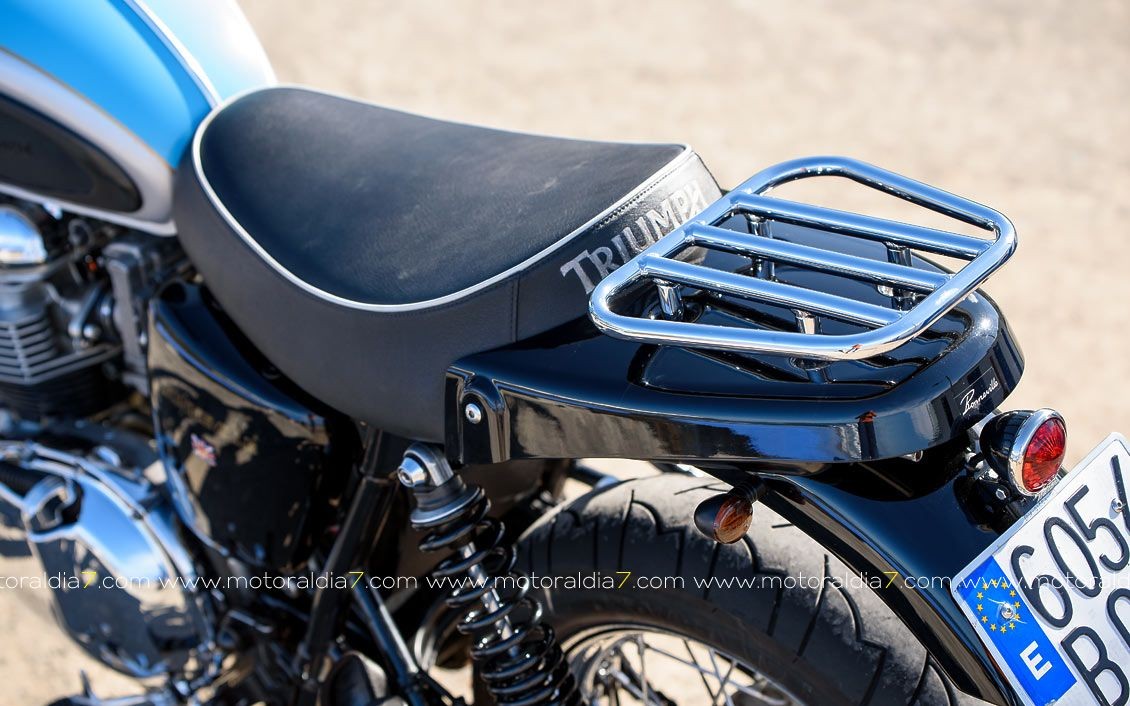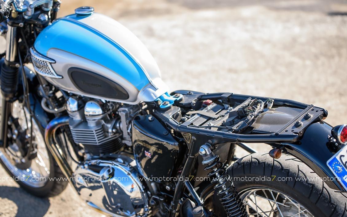 El piloto trasero de Led e indicadores más pequeños que los originales, por supuesto todo homologado. Por otro lado, también le he cambiado el color original Burdeos y gris, por otro original, que sacó Triumph en 1965 y reeditado en el 2002, que es el Sky Blue/Silver. Comentar que dispongo de otro tanque de combustible pintado en negro que lleva incorporada una parrilla porta objetos