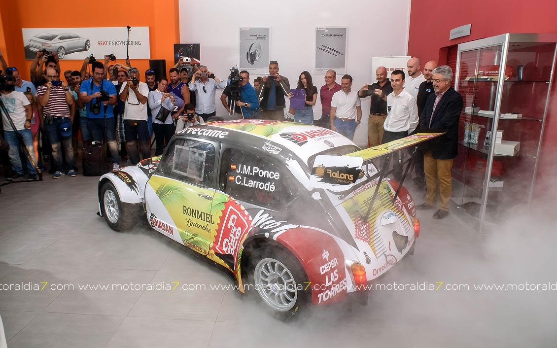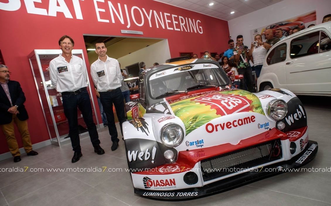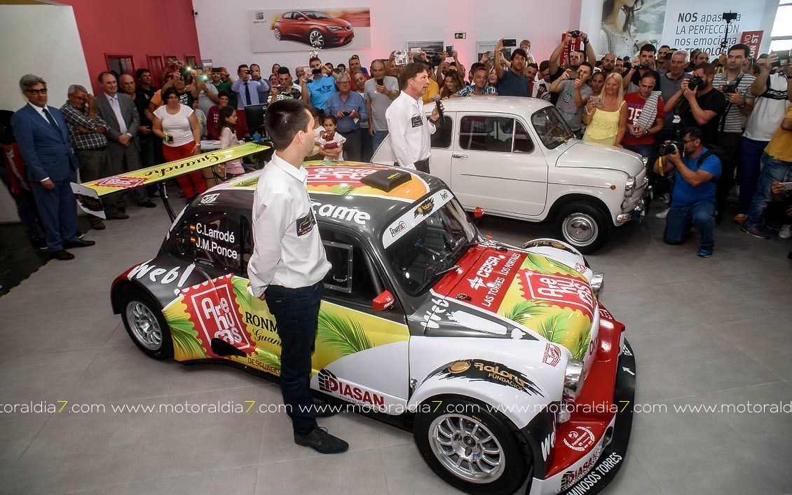 Impresionante acogida de los aficionados a la convocatoria, en las instalaciones de Orvecame SEAT en el Sebadal, de José Maria Ponce y Carlos Larrodé, que presentaba su vehículo con el que participarán en el 41º Rally Islas Canarias, un sorprendente y espectacular SEAT JTR 600, recientemente homologado para competir en Rallys. Básicamente se trata de un chasis de 600, con partes tubilares delante y detrás, con un motor de moto (Suzuki Hayabusa) de 1.300 cc. con cerca de 200 CV de potencia.