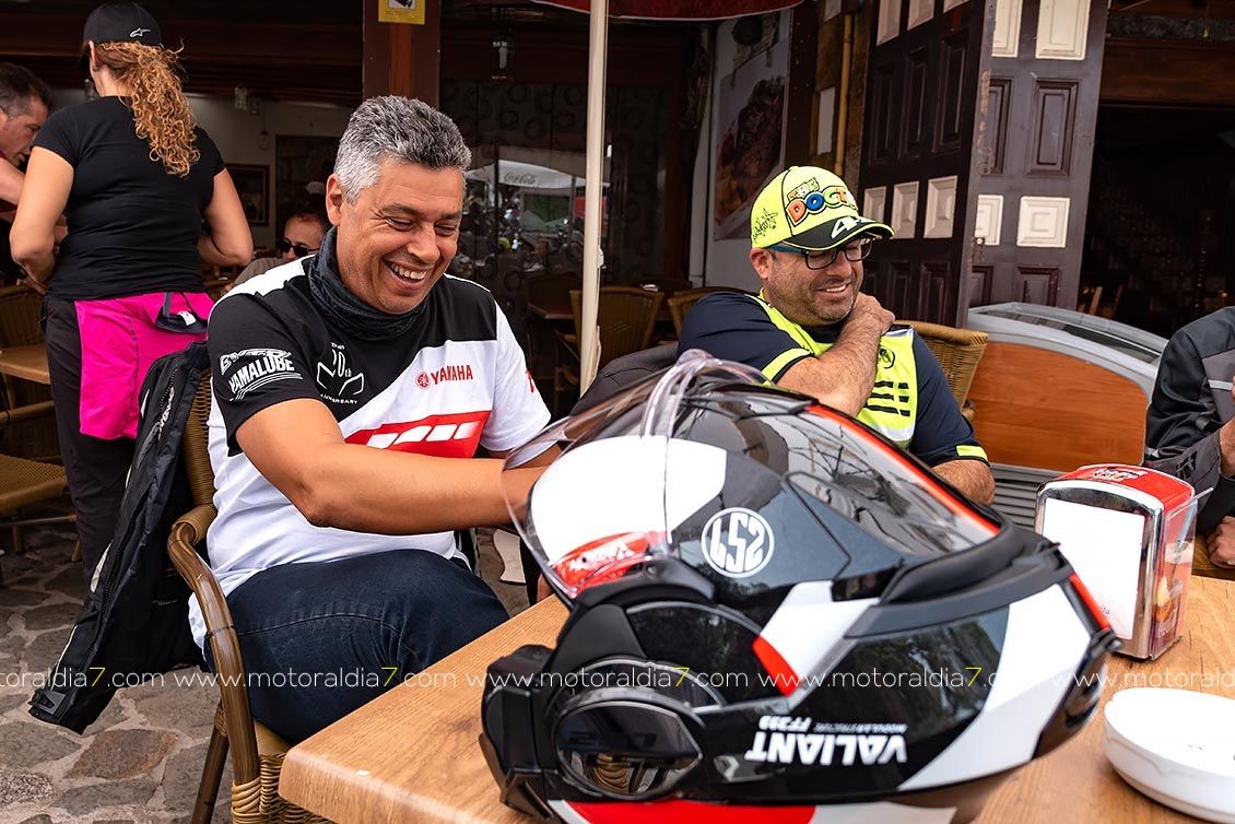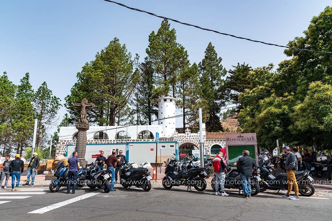 El recorrido de la ruta comenzaba con destino a Arucas, para subir por los Castillos, Los Chorros, Zumacal, Teror, Madre el agua, Ariñez y Cruz de Tejeda, donde se haría la primera parada para reponer y evacuar líquidos. Como es norma habitual en este punto se daban cita infinidad de moteros de todas las marcas, y los saludos entre todos es algo habitual e ineludible. Otra de las ventajas de conducir una moto....la cantidad de “amigos” que puedes hacer.