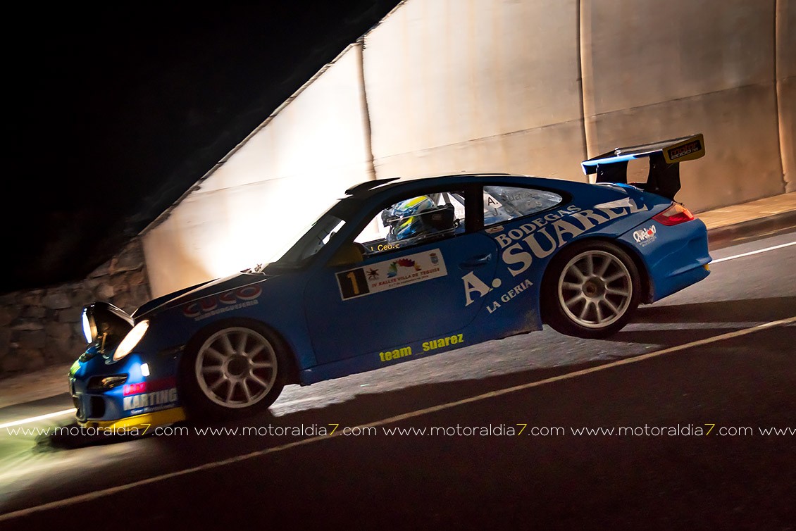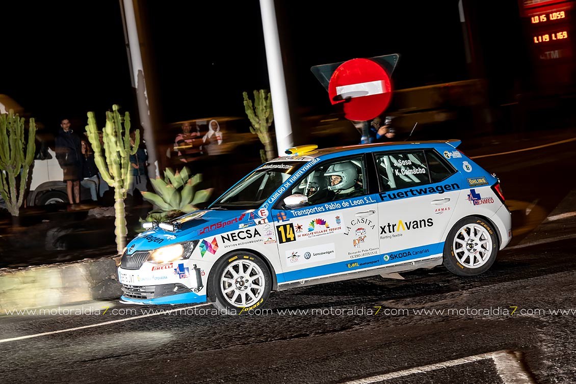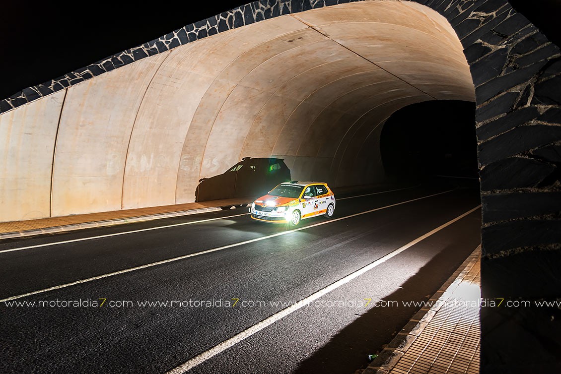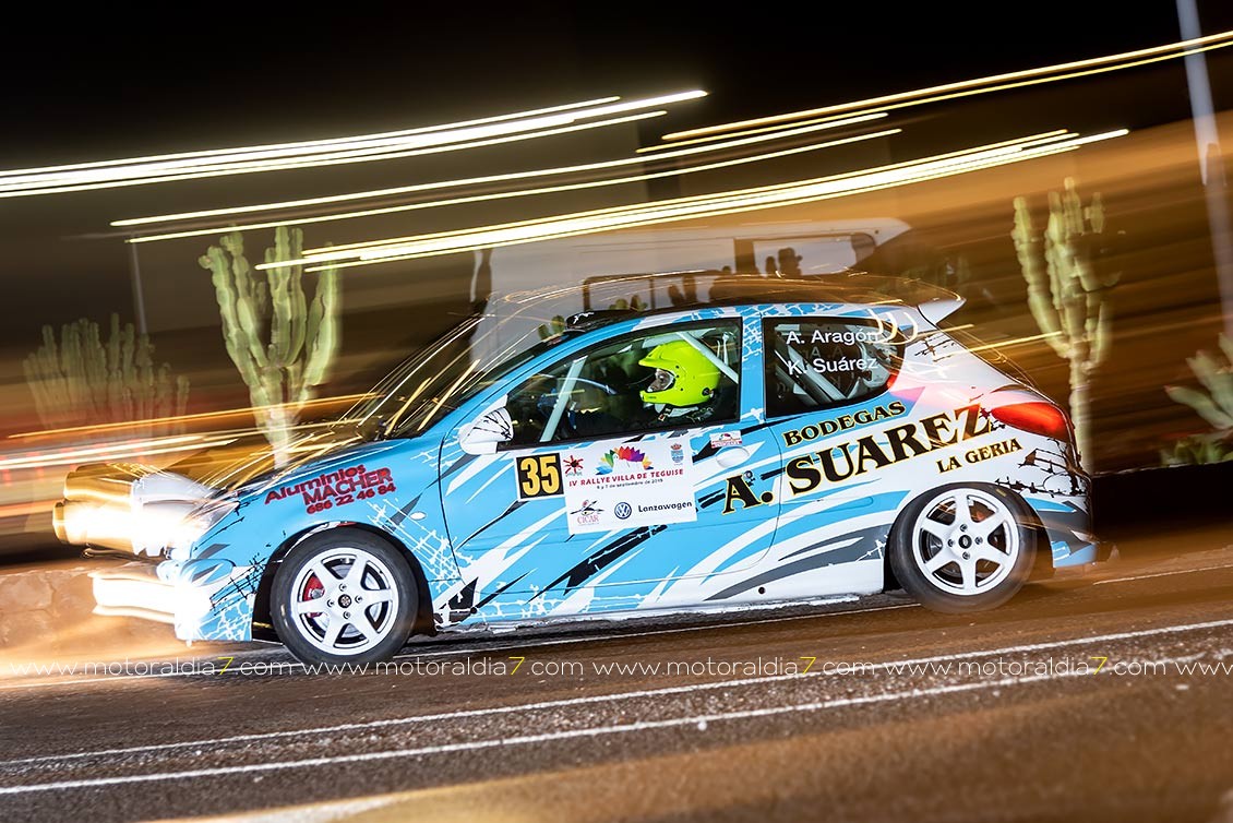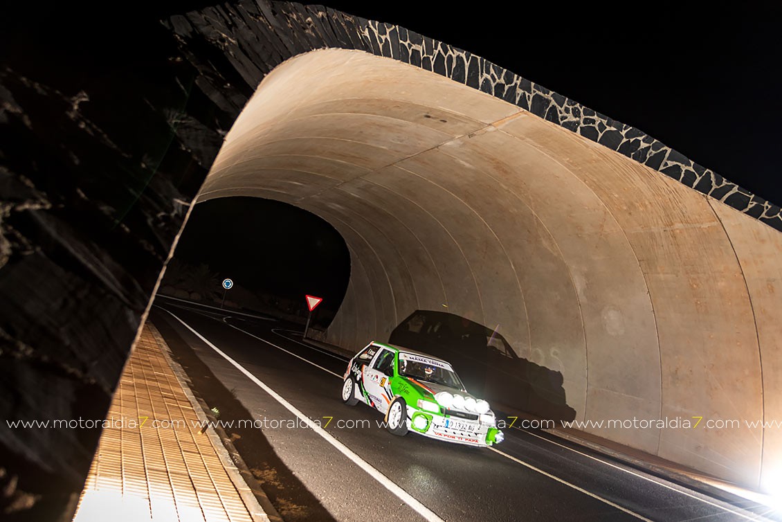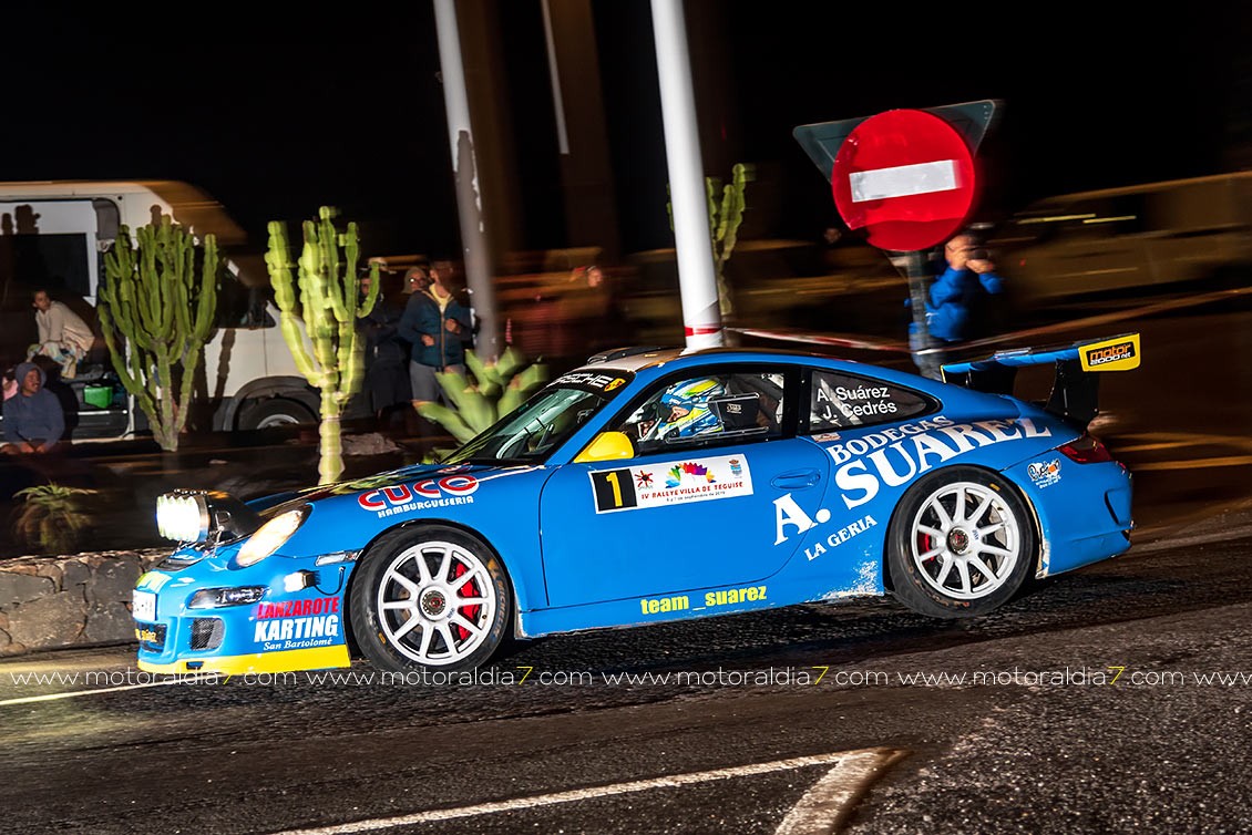 Ya con la noche sobre el cielo del norte dela isla de Lanzarote se disputaron los dos primeros tramos cronometrados del rutómetro compuesto por un total de ocho especiales. Esta primera parte del rallye tuvo de protagonista el tramo de Teseguite-Guatiza-El Mojón, con dos pasadas que han puesto de líder destacado al Porsche de Toñín Suárez y Jorge Cedrés, autor del scratch en el TC2. En la general, ya suman 16 segundos de ventaja sobre los segundos clasificados provisionales, Suso Lemes-Ayose Barrera con SEAT Ibiza y 1,1 segundos más sobre el Renault Megane de Adrián Betancort-Jorge Umpiérrez, terceros en el teórico podio después de la sección nocturna de la prueba. Este último equipo se adjudicó el triunfo de la última edición del “Villa de Teguise”, después de que fuera penalizado Toñín Suárez por unas irregularidades en su montura, por lo que sin duda este año quiere quitarse la “espinita” y volver a ser el más rápido.