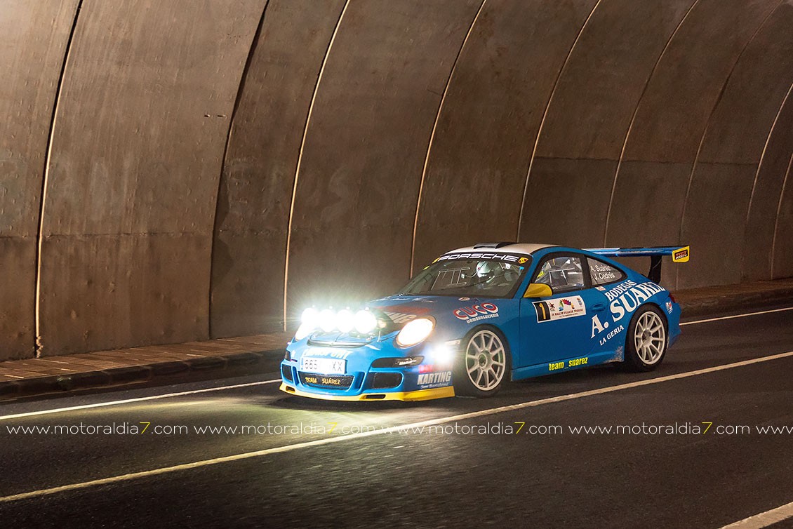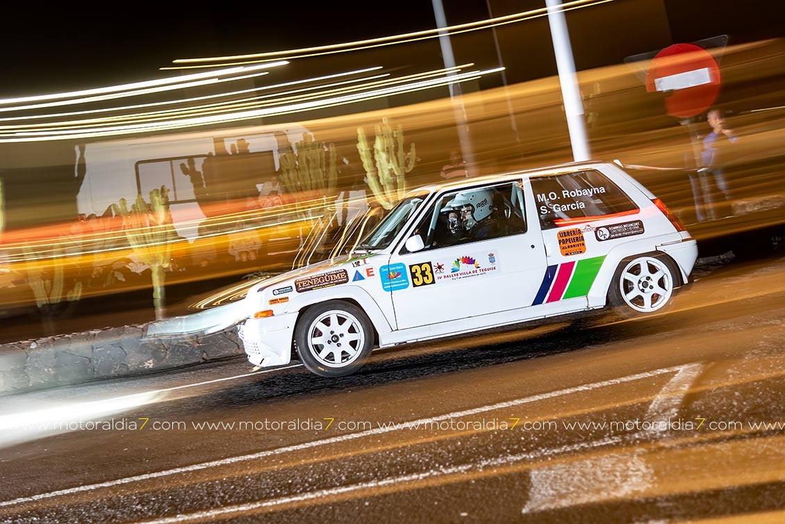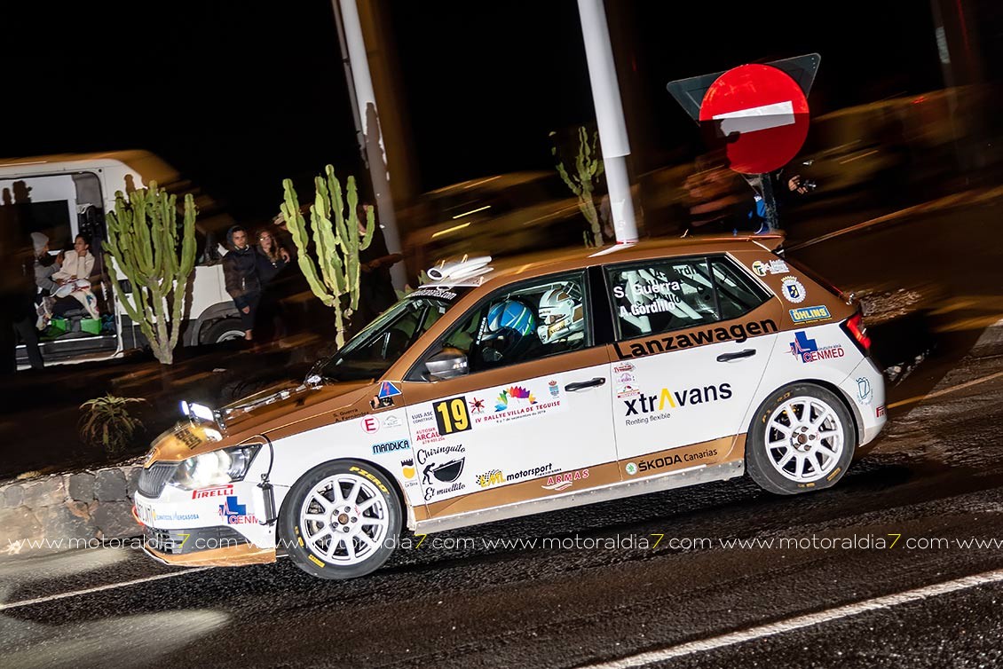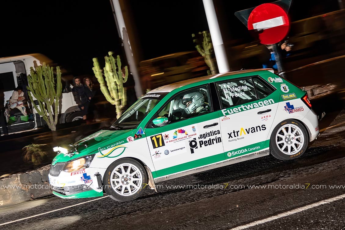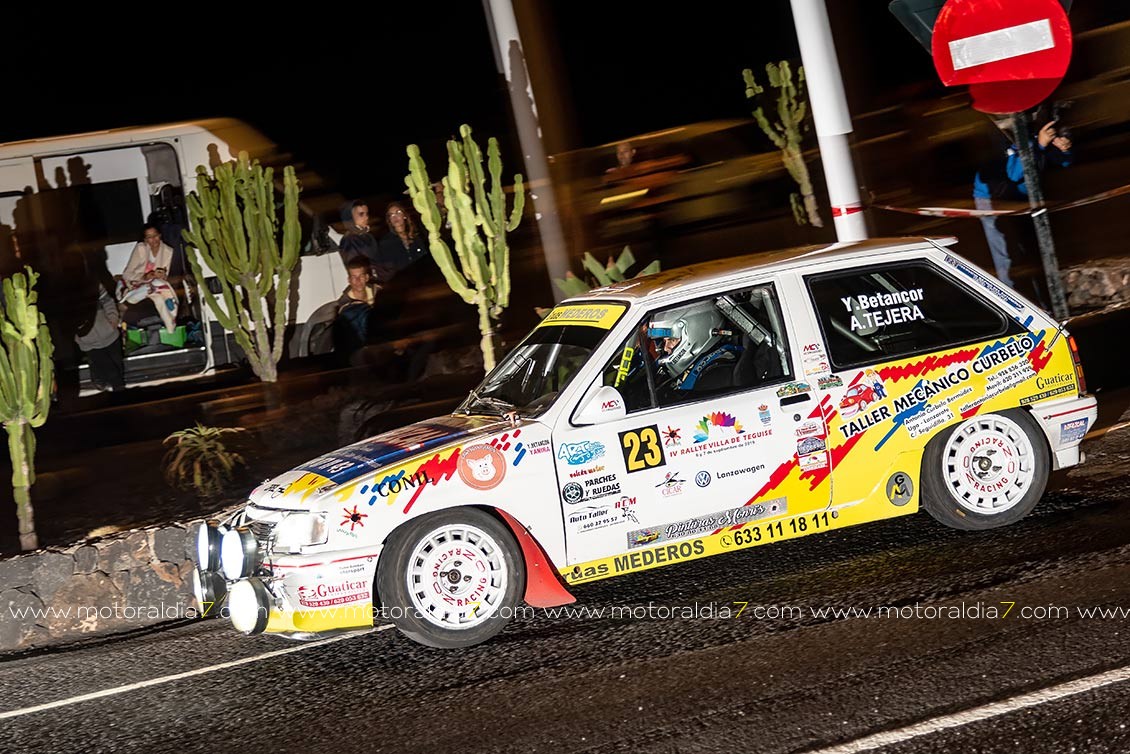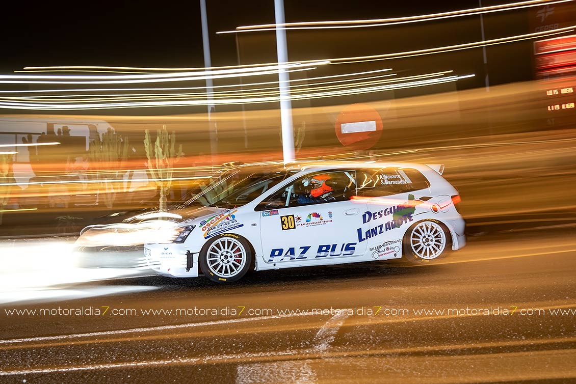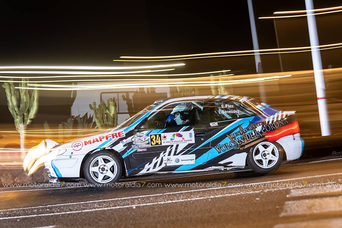 Ya con la noche sobre el cielo del norte dela isla de Lanzarote se disputaron los dos primeros tramos cronometrados del rutómetro compuesto por un total de ocho especiales. Esta primera parte del rallye tuvo de protagonista el tramo de Teseguite-Guatiza-El Mojón, con dos pasadas que han puesto de líder destacado al Porsche de Toñín Suárez y Jorge Cedrés, autor del scratch en el TC2. En la general, ya suman 16 segundos de ventaja sobre los segundos clasificados provisionales, Suso Lemes-Ayose Barrera con SEAT Ibiza y 1,1 segundos más sobre el Renault Megane de Adrián Betancort-Jorge Umpiérrez, terceros en el teórico podio después de la sección nocturna de la prueba. Este último equipo se adjudicó el triunfo de la última edición del “Villa de Teguise”, después de que fuera penalizado Toñín Suárez por unas irregularidades en su montura, por lo que sin duda este año quiere quitarse la “espinita” y volver a ser el más rápido.