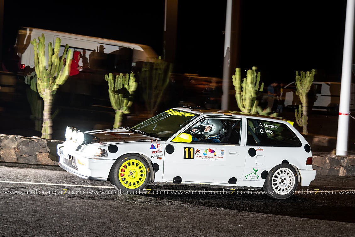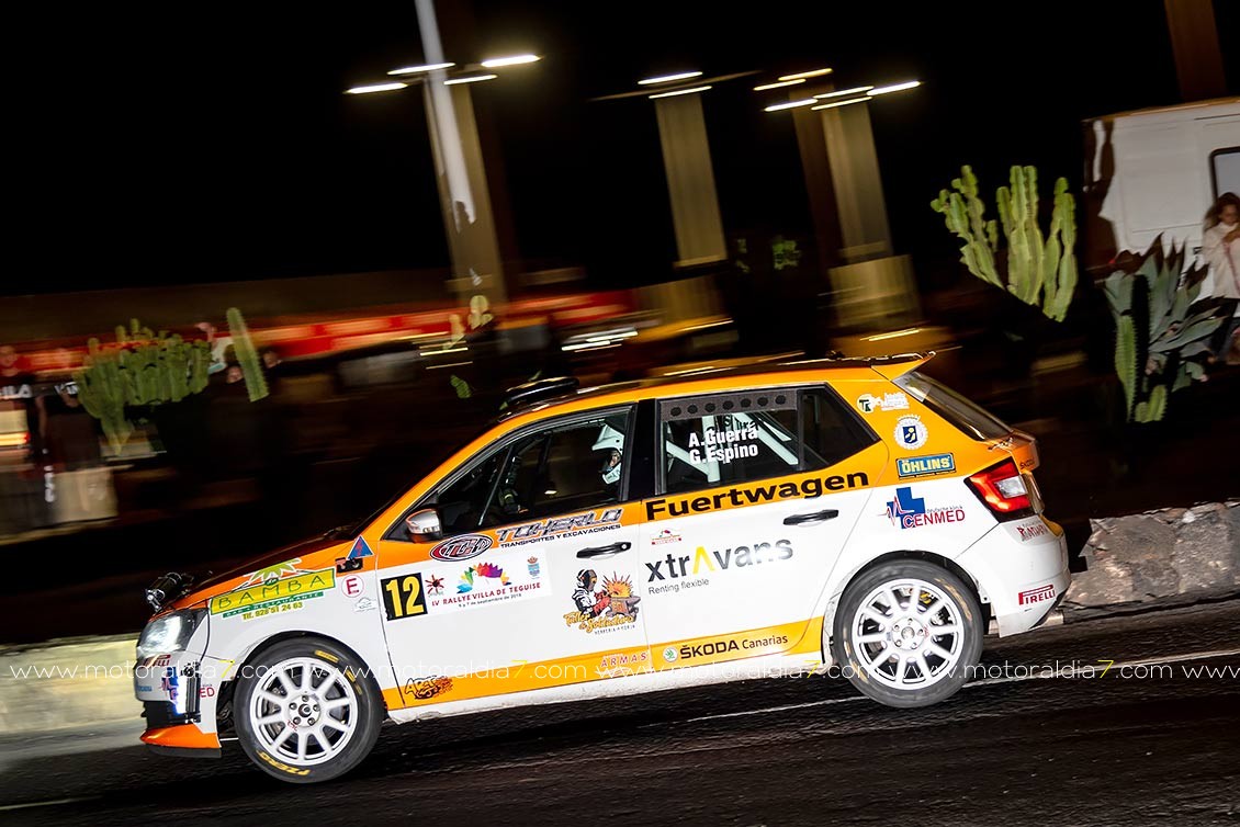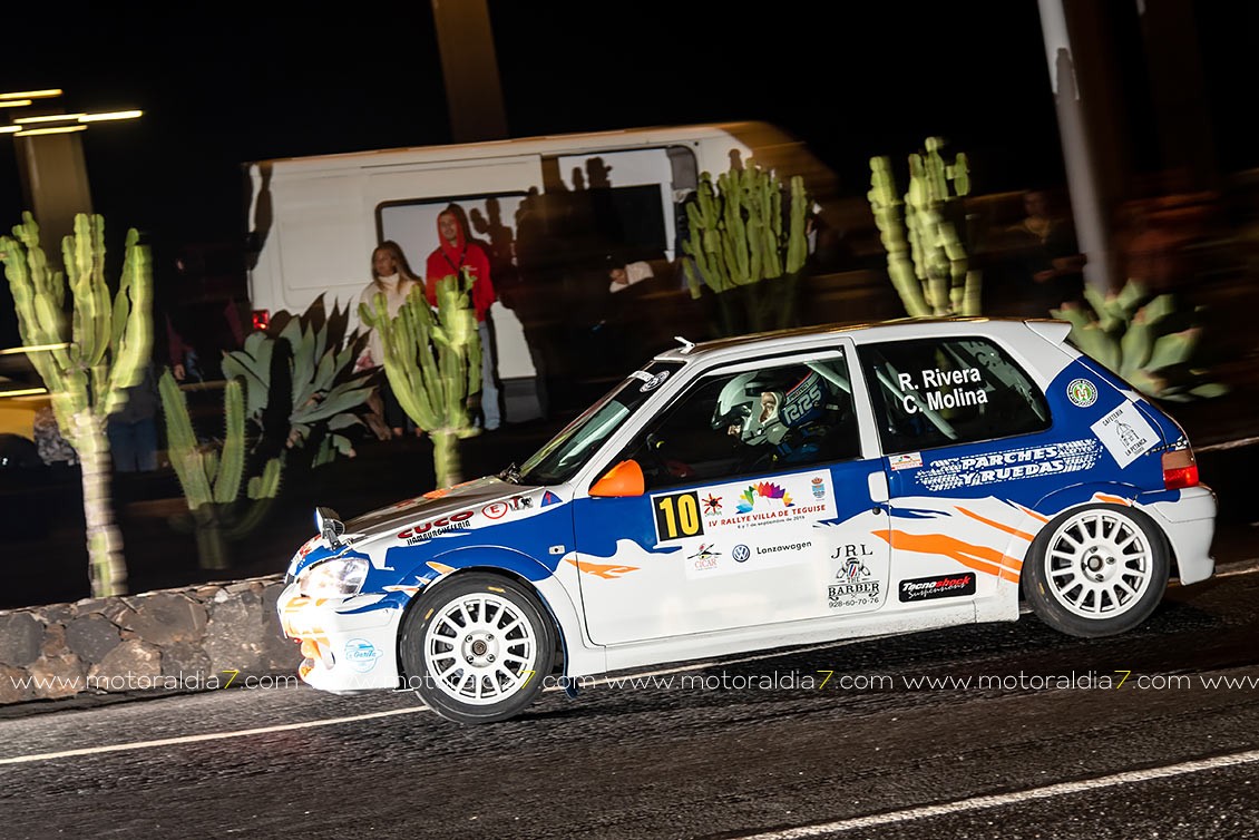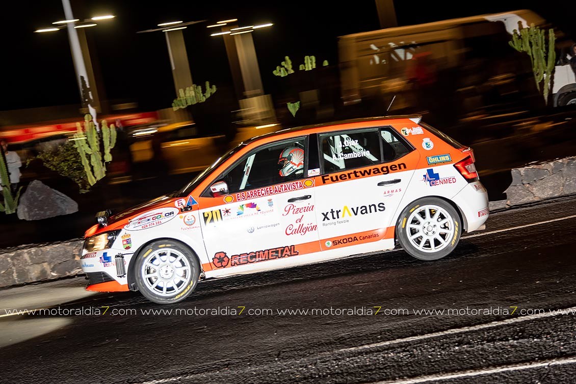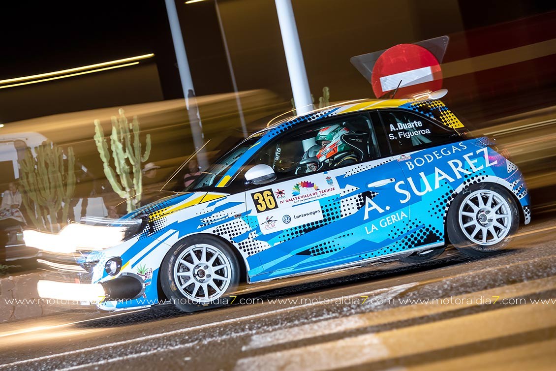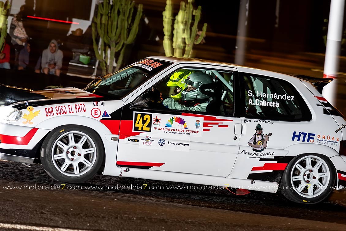 Ya con la noche sobre el cielo del norte dela isla de Lanzarote se disputaron los dos primeros tramos cronometrados del rutómetro compuesto por un total de ocho especiales. Esta primera parte del rallye tuvo de protagonista el tramo de Teseguite-Guatiza-El Mojón, con dos pasadas que han puesto de líder destacado al Porsche de Toñín Suárez y Jorge Cedrés, autor del scratch en el TC2. En la general, ya suman 16 segundos de ventaja sobre los segundos clasificados provisionales, Suso Lemes-Ayose Barrera con SEAT Ibiza y 1,1 segundos más sobre el Renault Megane de Adrián Betancort-Jorge Umpiérrez, terceros en el teórico podio después de la sección nocturna de la prueba. Este último equipo se adjudicó el triunfo de la última edición del “Villa de Teguise”, después de que fuera penalizado Toñín Suárez por unas irregularidades en su montura, por lo que sin duda este año quiere quitarse la “espinita” y volver a ser el más rápido.