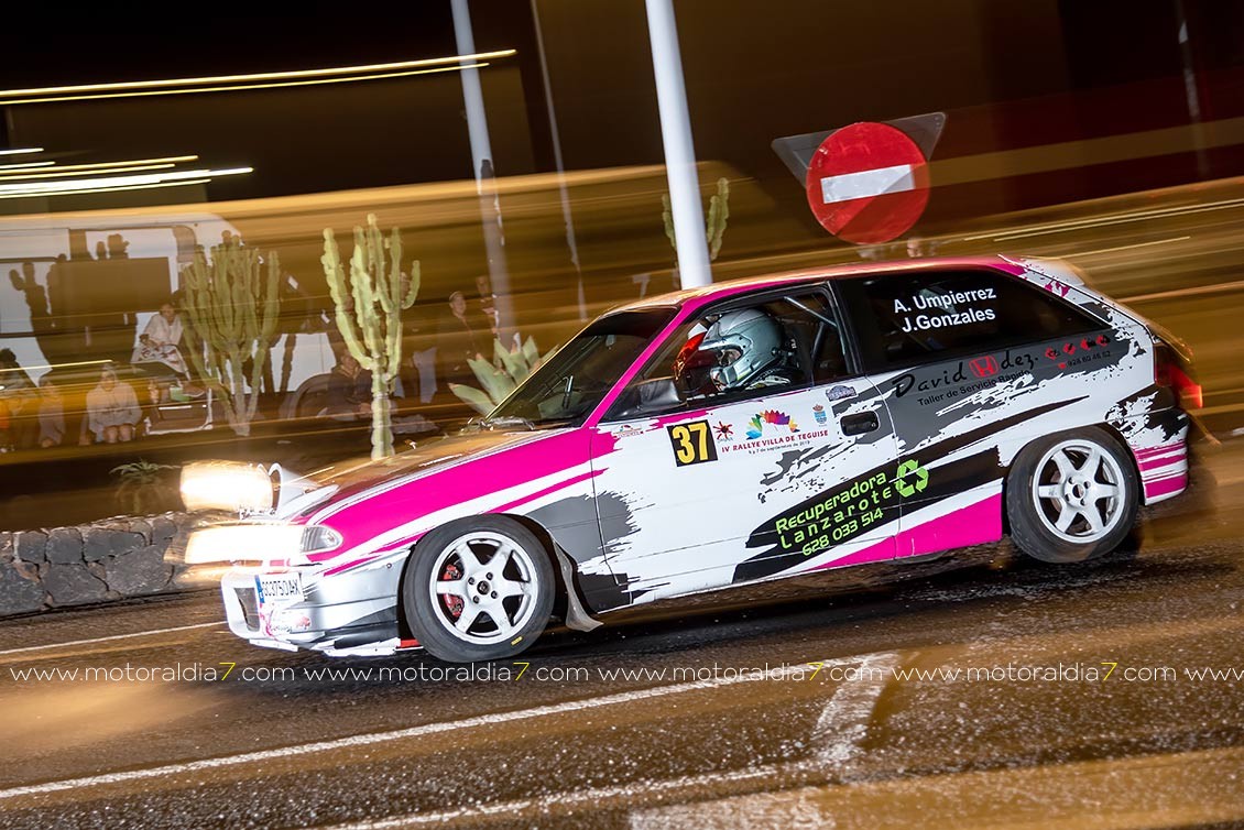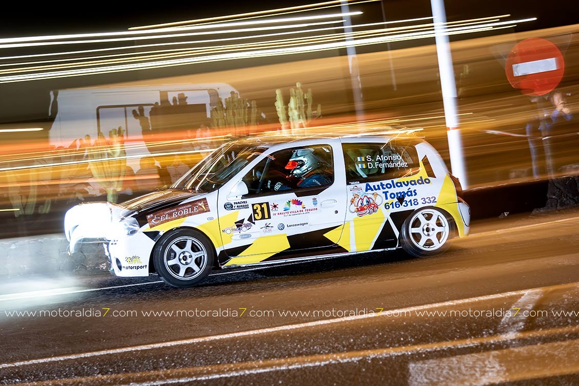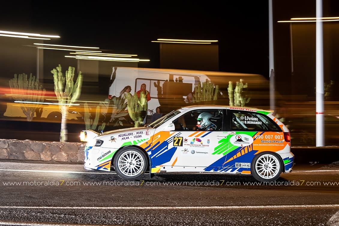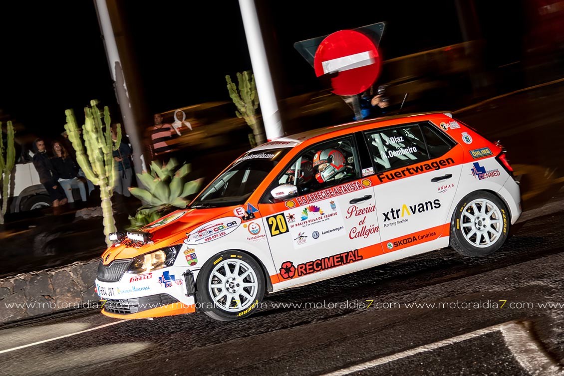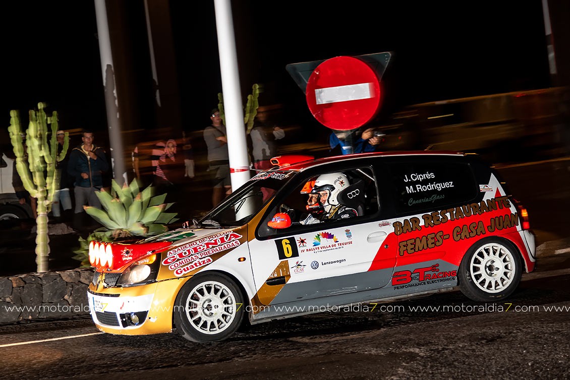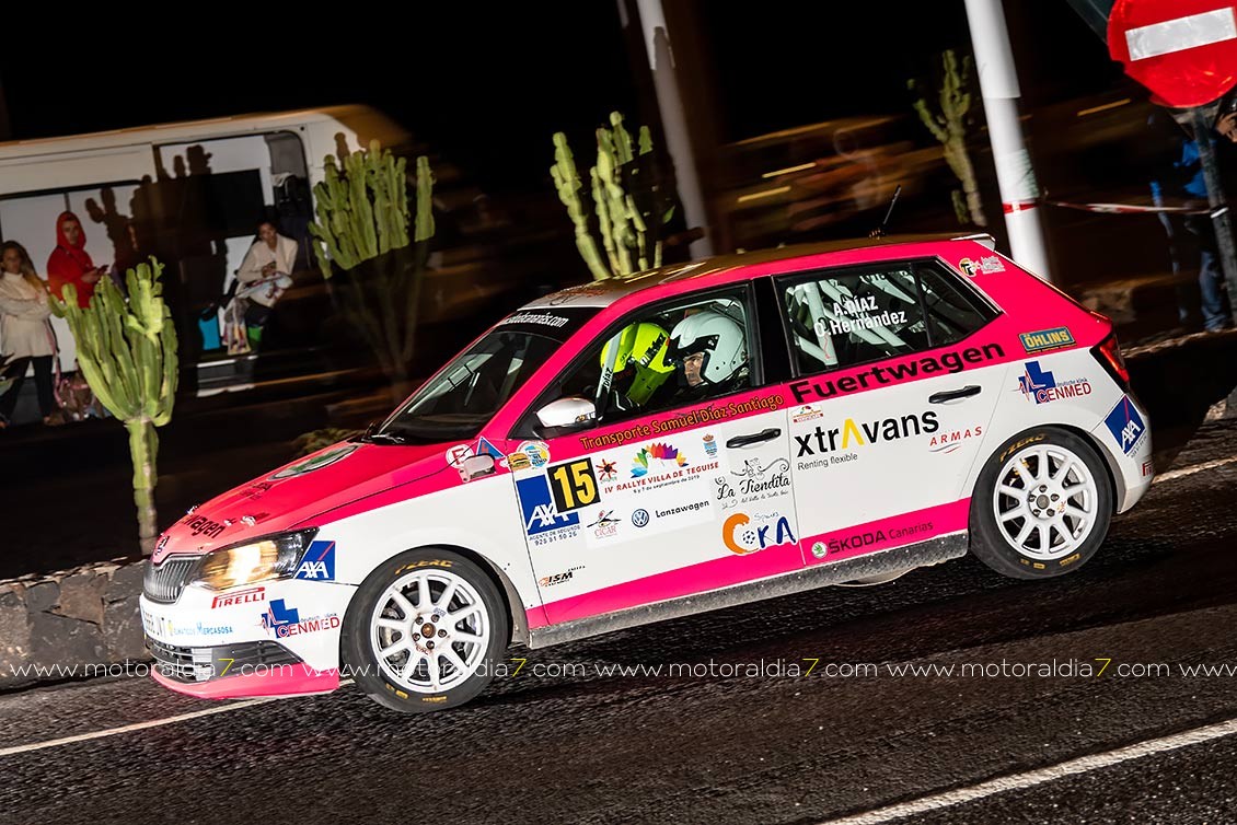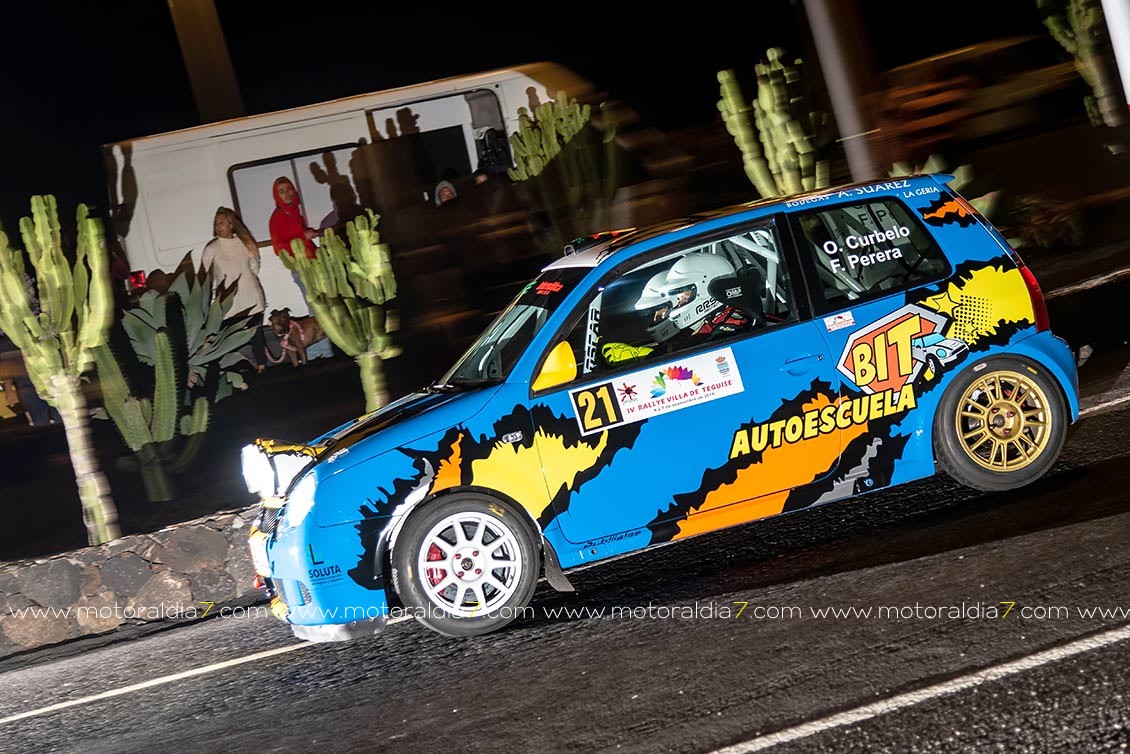 Ya con la noche sobre el cielo del norte dela isla de Lanzarote se disputaron los dos primeros tramos cronometrados del rutómetro compuesto por un total de ocho especiales. Esta primera parte del rallye tuvo de protagonista el tramo de Teseguite-Guatiza-El Mojón, con dos pasadas que han puesto de líder destacado al Porsche de Toñín Suárez y Jorge Cedrés, autor del scratch en el TC2. En la general, ya suman 16 segundos de ventaja sobre los segundos clasificados provisionales, Suso Lemes-Ayose Barrera con SEAT Ibiza y 1,1 segundos más sobre el Renault Megane de Adrián Betancort-Jorge Umpiérrez, terceros en el teórico podio después de la sección nocturna de la prueba. Este último equipo se adjudicó el triunfo de la última edición del “Villa de Teguise”, después de que fuera penalizado Toñín Suárez por unas irregularidades en su montura, por lo que sin duda este año quiere quitarse la “espinita” y volver a ser el más rápido.