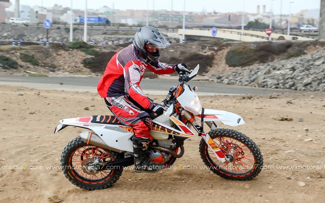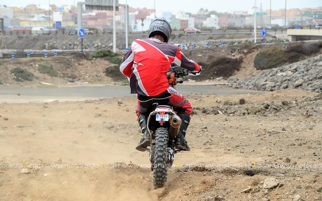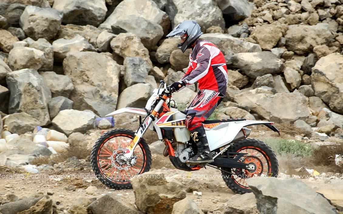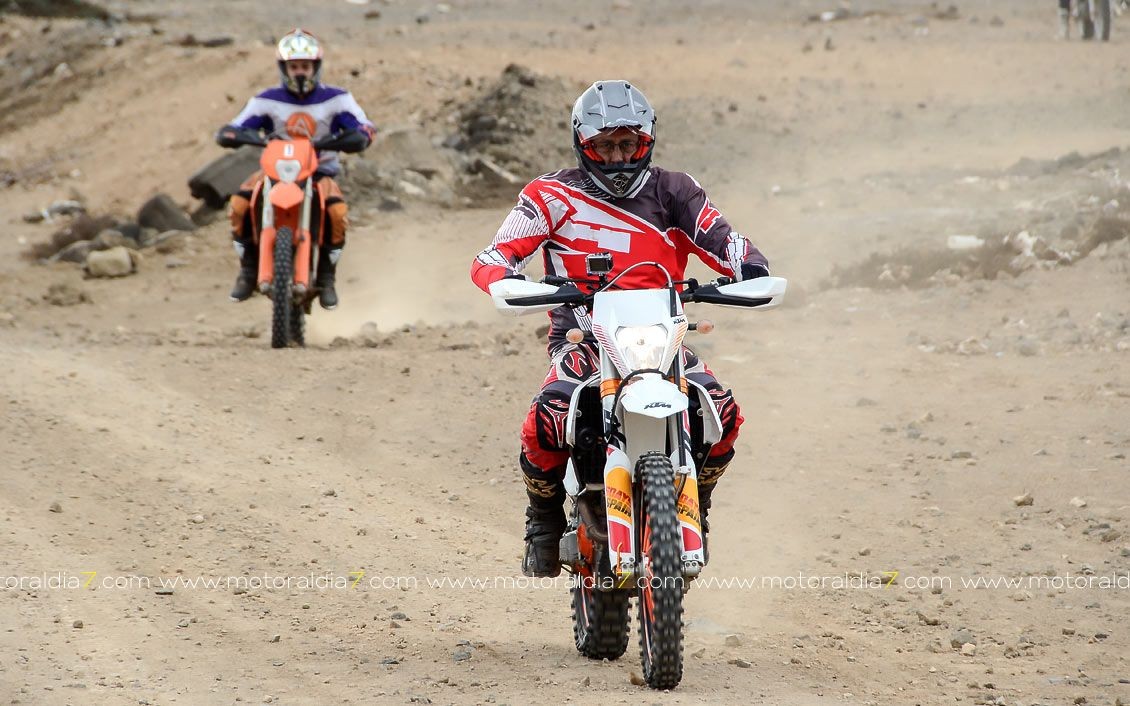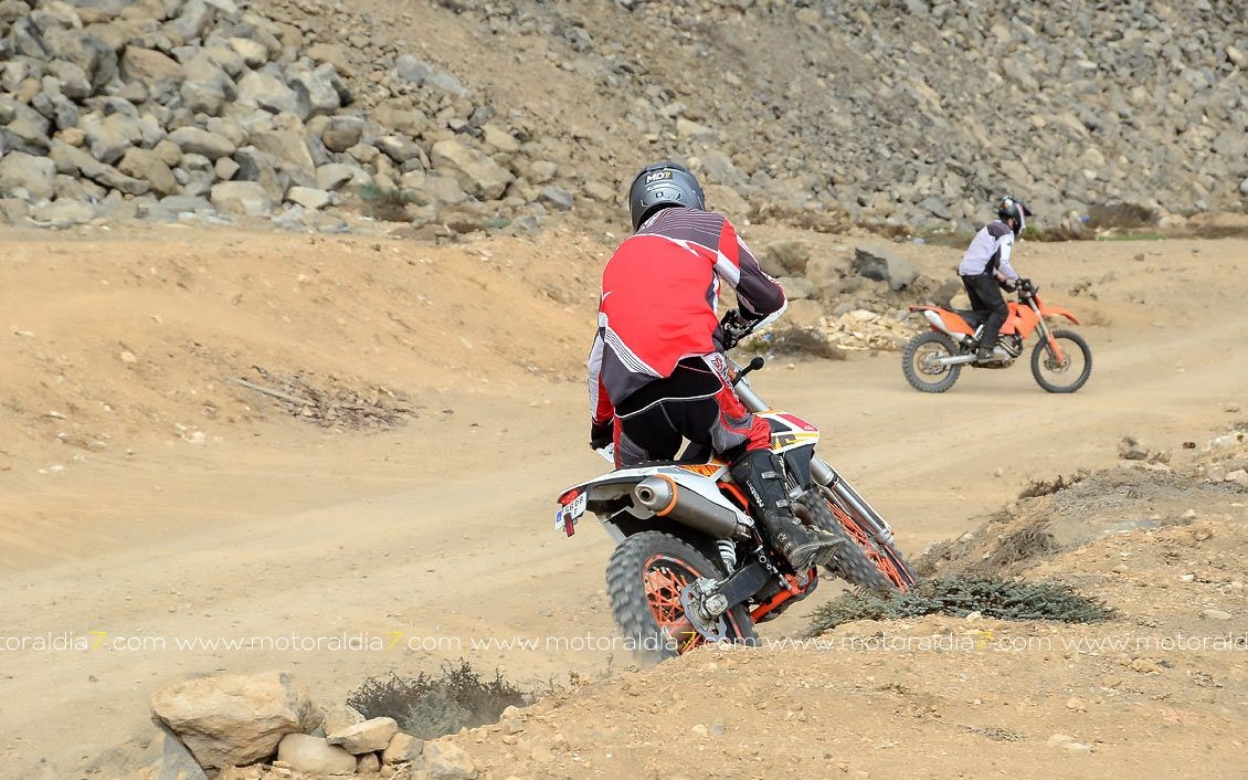 Después de unos cientos de metros, pasamos a la posición de pie (siempre guiados por Pedro Peñate, que vigila nuestras evoluciones). Ahora empieza lo bueno…..de pie sobre ella todo es más difícil, pero nos acordamos de los consejos que nos han dado antes de subirnos, y poco a poco vamos cogiendo confianza y llegando incluso a circular en tercera velocidad. Vamos lentos pero seguros. La KTM 350 Six Day no deja de sorprenderme, y lentamente ella y yo nos vamos haciendo uno. Sobre todo nos cuesta la tarea de subir y bajar marchas con unas botas de enduro que son la primera vez que las usamos, y a las que poco a poco nos vamos también acostumbrando.