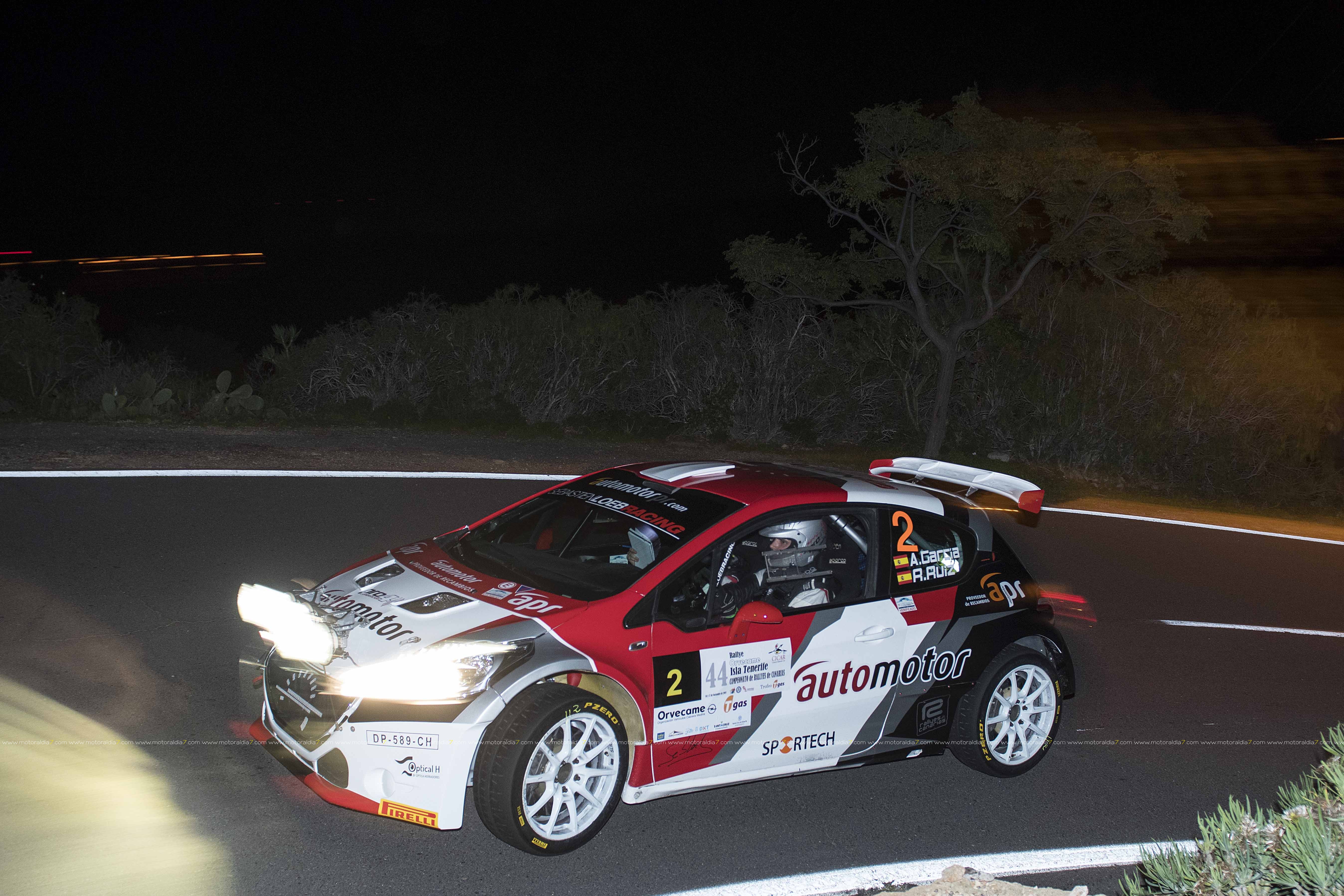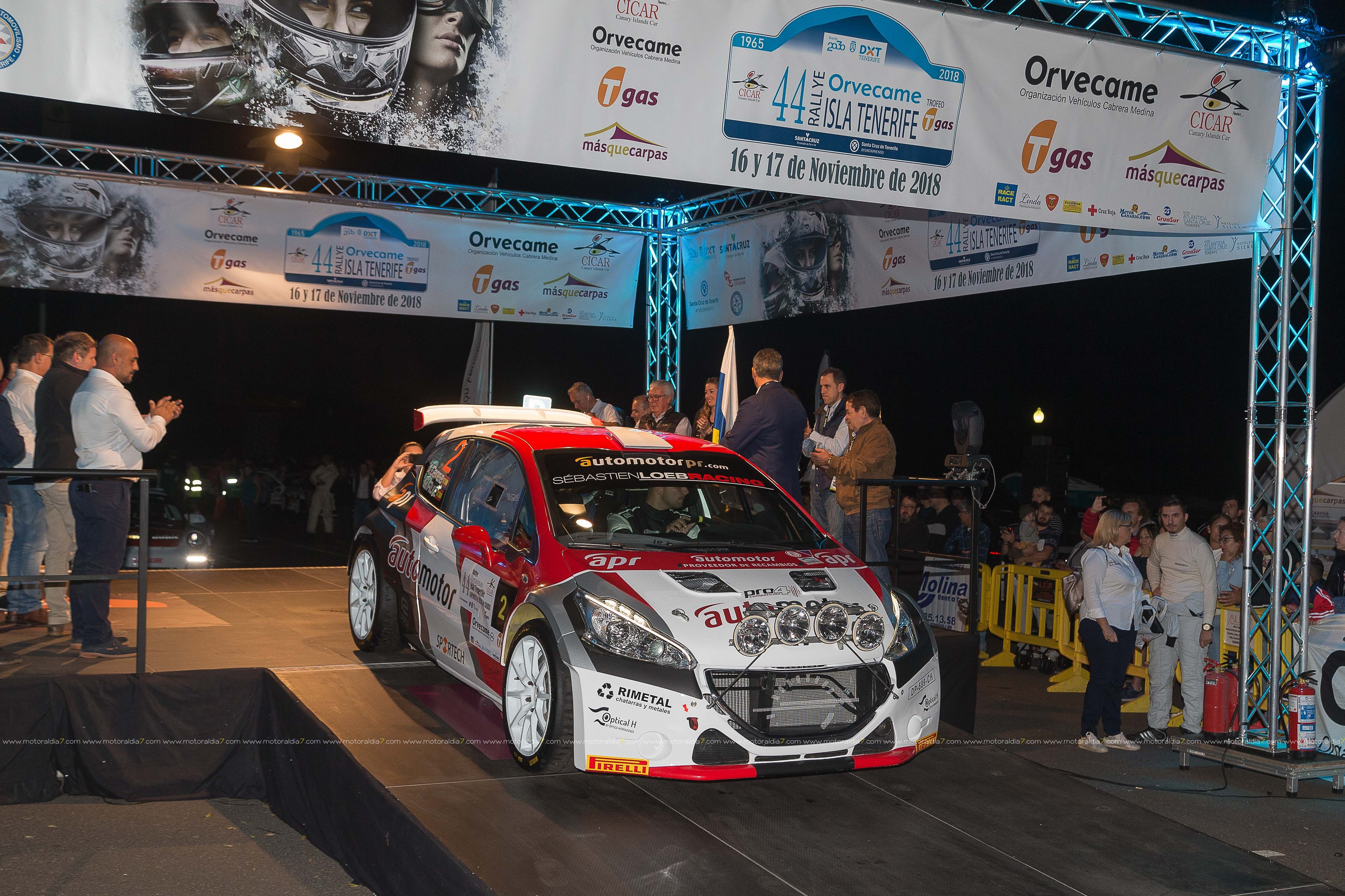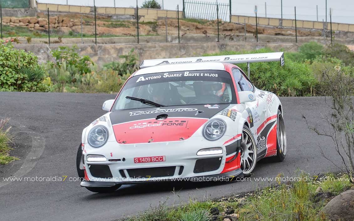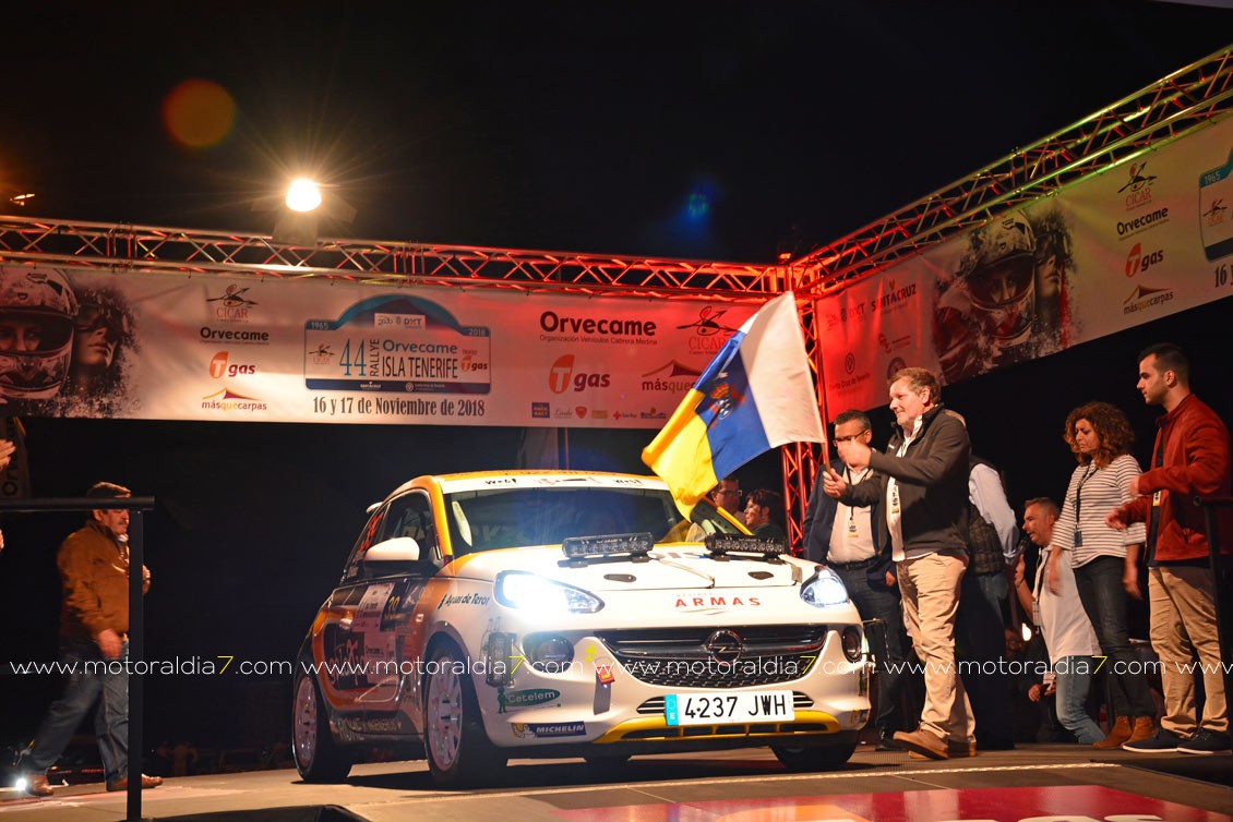 Desde la primera especial, el equipo de Enrique Cruz y Yeray Mújica con Porsche 997 se impusieron en el 44º Rally Orvecame Isla Tenerife Trofeo Tgas aunque por muy poca ventaja, terminado la etapa con una diferencia de 5.8 segundos sobre los segundos Lauren García y Néstor Gómez con Porsche 997. La noticia la marcaban Adrián García y Raquel Ruiz con el Peugeot 208 y una avería en el embrague que les relegaba a la décima posición de la clasificación a 2 minutos y 12 segundos de los primeros. El equipo decidió retirarse a la entrada del parque de trabajo. Terceros, y cerrando el podio provisional, José Mari Ponce y Carlos Larrodé con Seat JTR 600. La exigencia de la primera etapa deja fuera de carrera a 7 equipos más 9 equipos reenganchados al super rally.