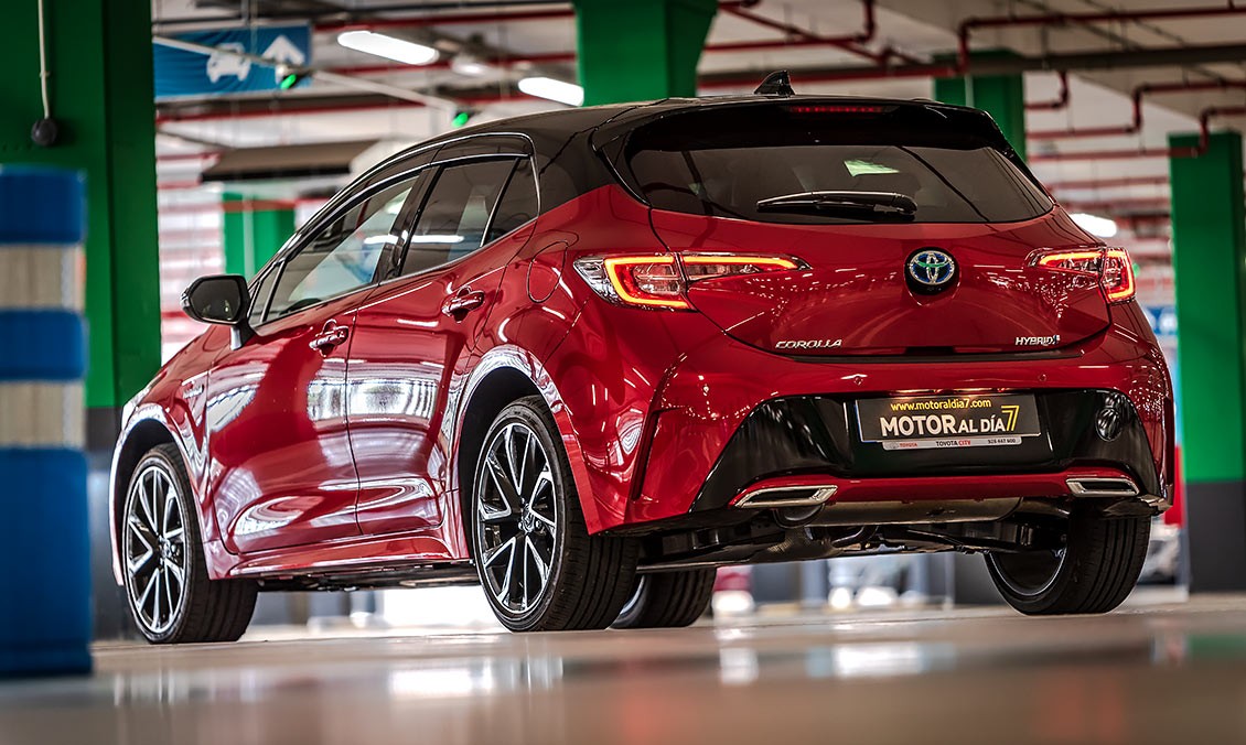 Queda patente, en sus líneas maestras, que estamos ante un Toyota, pero sí que se nota ese toque deportivo que lo diferencia de los demás coches de la competencia. Por ejemplo, la estrecha parrilla superior incorpora unos grupos ópticos LED con Luces de Circulación Diurna —Daytime Running Lights (DRL)— integradas. O la zona alrededor de la gran parrilla inferior trapezoidal que esta generosamente hacia delante. Es menos puntiaguda y más vertical, lo que da lugar a una reducción del voladizo delantero del vehículo. En los bordes invertidos del alerón frontal se encuentran unos nuevos faros antiniebla LED. El propio entramado de la parrilla presenta además un diseño más articulado y refinado.