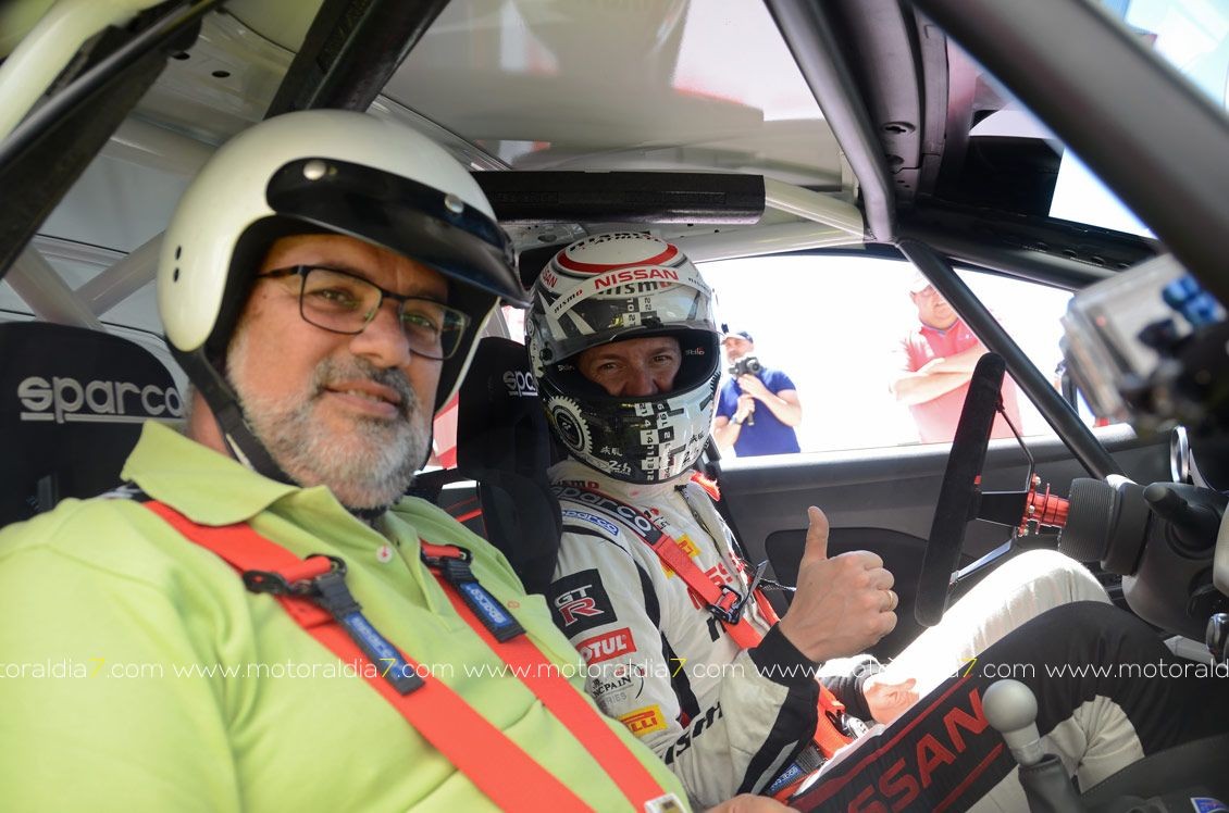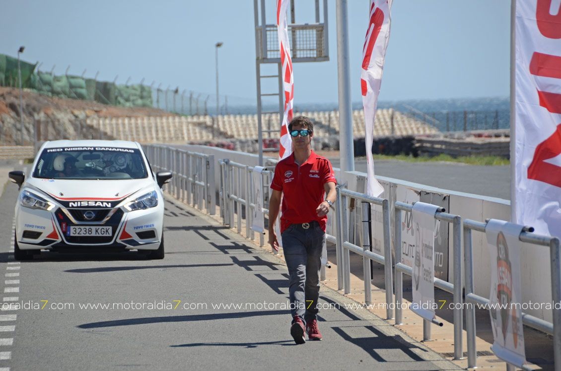 El piloto oficial de Nissan NISMO, Lucas Ordoñez, fue el piloto encargado de dar las primeras vueltas al Circuito de Maspalomas, acompañado a la derecha por los periodistas invitados, que se bajaban encantados con la conducción del piloto madrileño y del comportamiento del Nissan Micra.