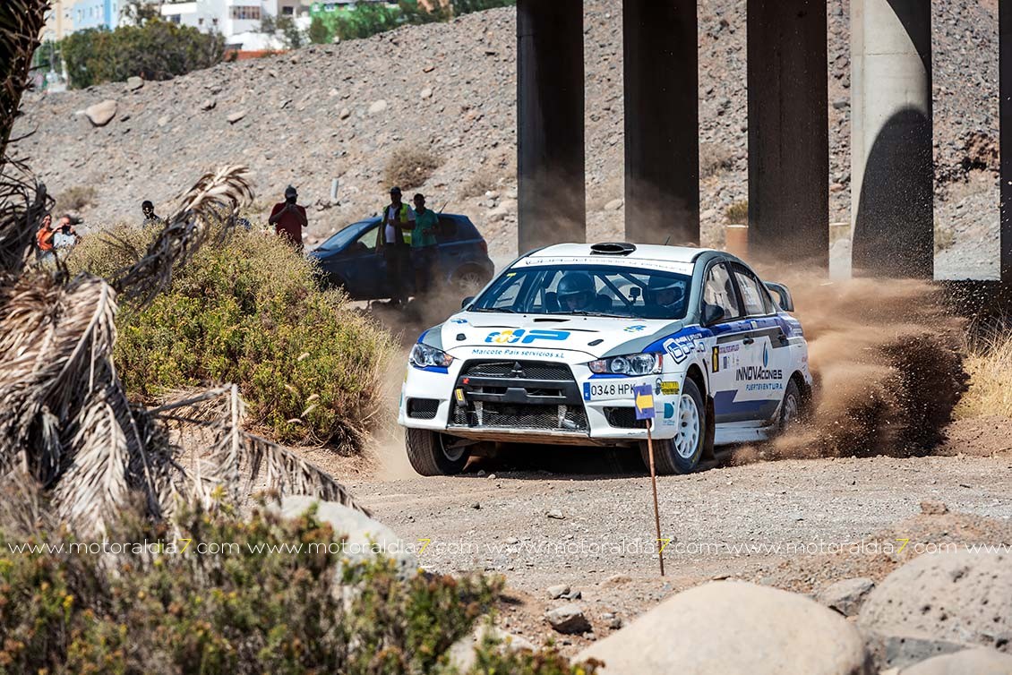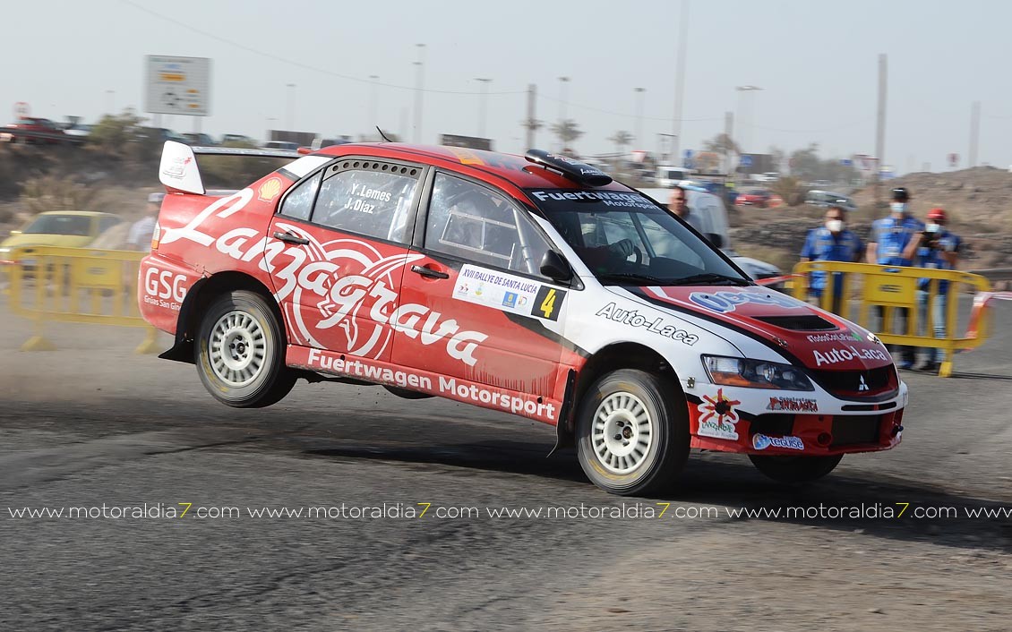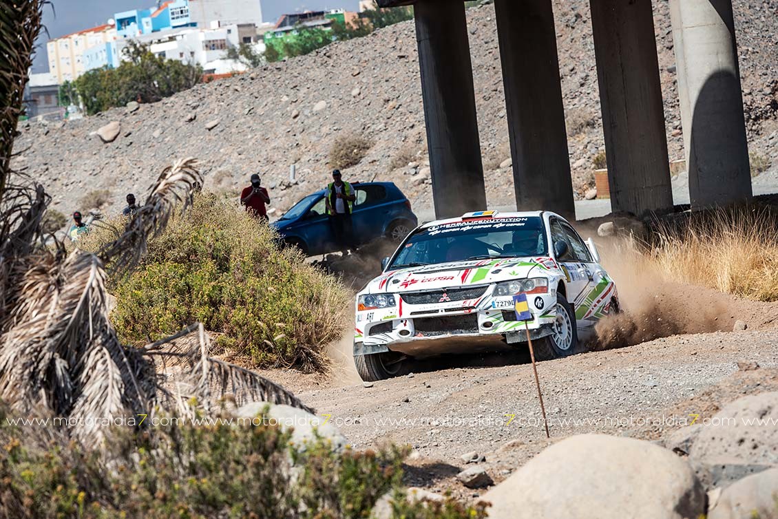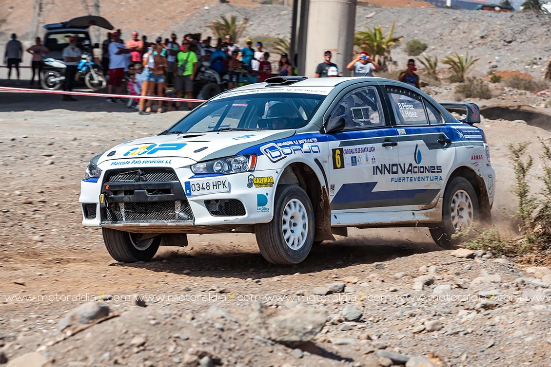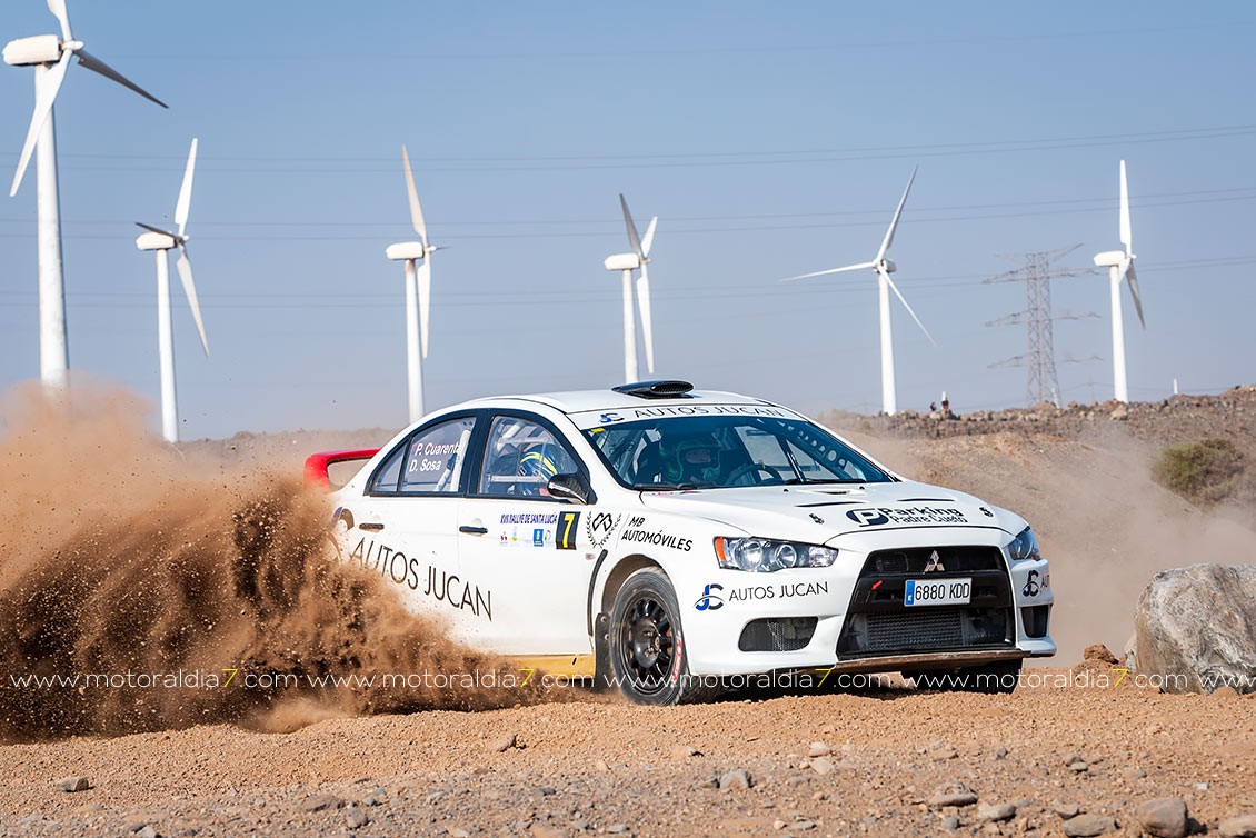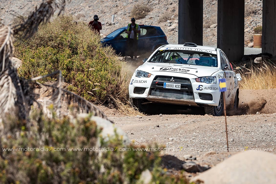 Los primeros líderes del rally fueron Juan Carlos Quintana-Yeray Mujica, que desde el primer tramo imprimieron un ritmo alto, aunque ya el piloto se quejaba de unos extraños en el motor de su Mitsubishi Lancer Evo X. Un problema que fue en aumento y debían retirarse antes de la salida del TC4, tramo donde tomaban el liderato Jesús Tacoronte-Mariola Sáez con su Evo IX, que gracias a su scratch en dicha especial de Juan Grande-Bahía Feliz, pasaban del tercer al primer puesto en la general en ese momento con 7,8 segundos de ventaja sobre Gustavo Sosa-Ariday Bonilla, que venían conservando ganas de correr para preservar la mecánica de su Skoda Fabia R5, mientras Borja Pérez-Jonathan Hernández tomaban el tercer lugar del podio con otro Evo X, pero ya a 42 segundos del nuevo líder.