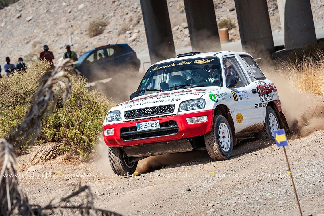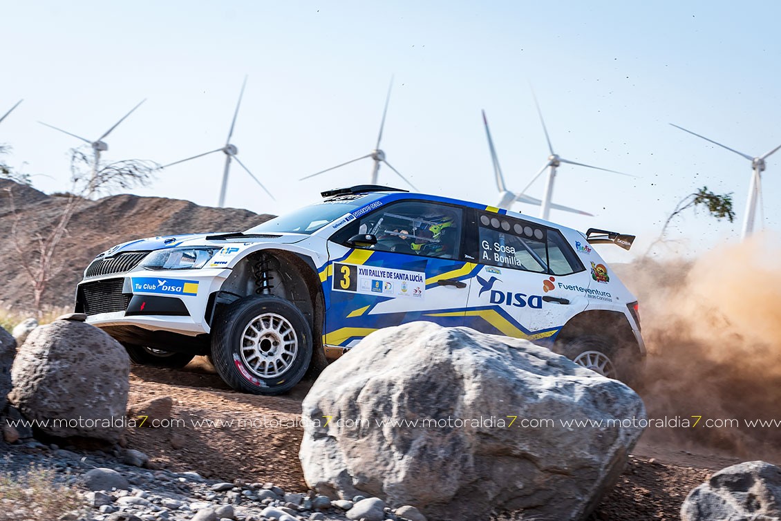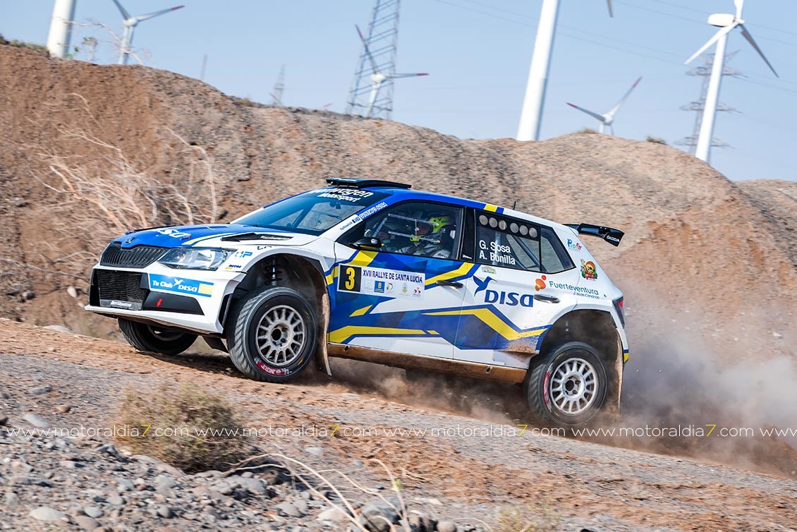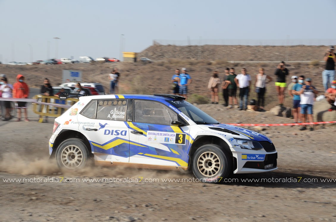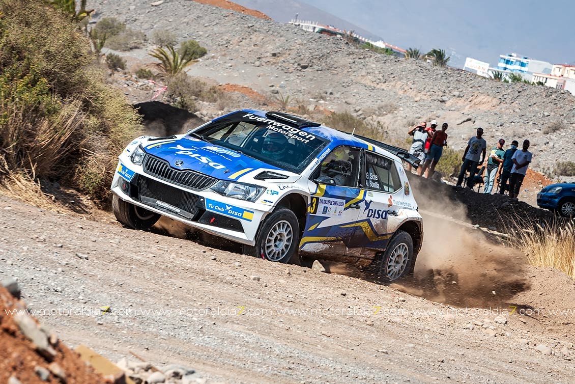 La segunda posición final ha sido para Gustavo Sosa-Ariday Bonilla (Skoda Fabia R5), que se mantuvieron en la segunda plaza a lo largo de casi toda la prueba, hasta que decidieron apretar en los dos tramos finales, reduciendo la ventaja de Tacoronte a sólo 1,3 segundos a falta de dos tramos. Lo dieron todo y se lanzaron a tope, pero con la mala suerte de cometer el único fallo de la jornada al pinchar en la rueda trasera derecha en el TC7, lo que impidió su posible scratch. Tacoronte no estaba ajeno al empuje de su rival y no se lo puso nada fácil: También imprimía más brío a su pilotaje y se hacía con el mejor crono del TC6 y cedían solamente 0,4 segundos en el último TC, cosechando la segunda victoria consecutiva en el rallye de tierra grancanario.