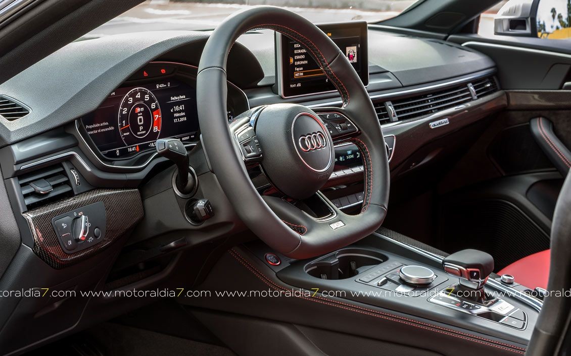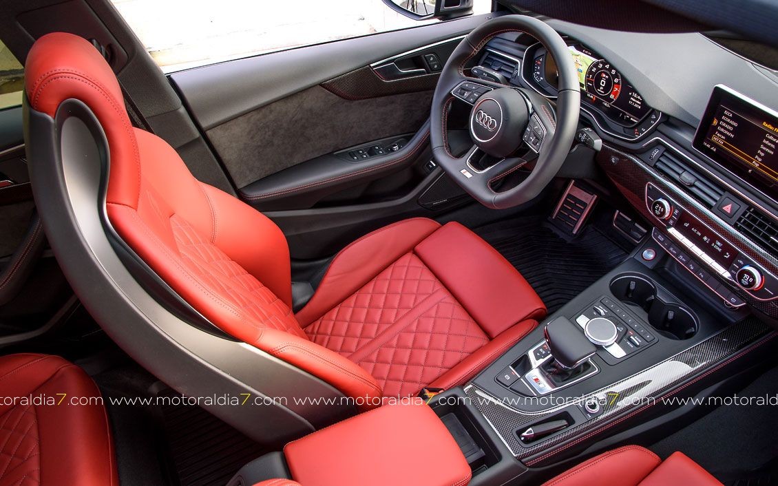 El habitáculo del Audi S5 también refleja también deportividad y aunque no se renuncia a su imagen elegante, lujosa y exclusiva, sí se puede apreciar ese toque 'sport' combinado a su vez con una mayor sensación de espacio. Además de las placas específicas del S5 en los umbrales de las puertas, añadimos detalles como el volante y el pomo de la palanca de cambio de diseño exclusivo, así como en otros detalles puntuales y terminaciones en fibra de carbono.