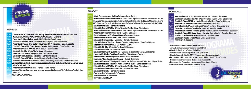La edición 2017 será inaugurada por el alcalde Augusto Hidalgo el viernes día 21 de abril a las 11:00  horas y estará abierta hasta el domingo 23. El marco elegido desde la primera edición ha sido el Parque Santa Catalina y todo su entorno y para la III LPA MOTOWN-SAGULPA al Edificio Miller se une el Museo Elder, que mantendrá unas jornadas de puertas abiertas para el público en general durante todo el fín de semana y una exposición de motos y bicicletas clásicas de primerísimo nivel y se mantiene la zona del Intercambiador para los circuitos de seguridad vial, incorporando para esta edición un circuito de motos eléctricas y las exhibiciones.