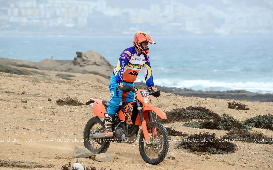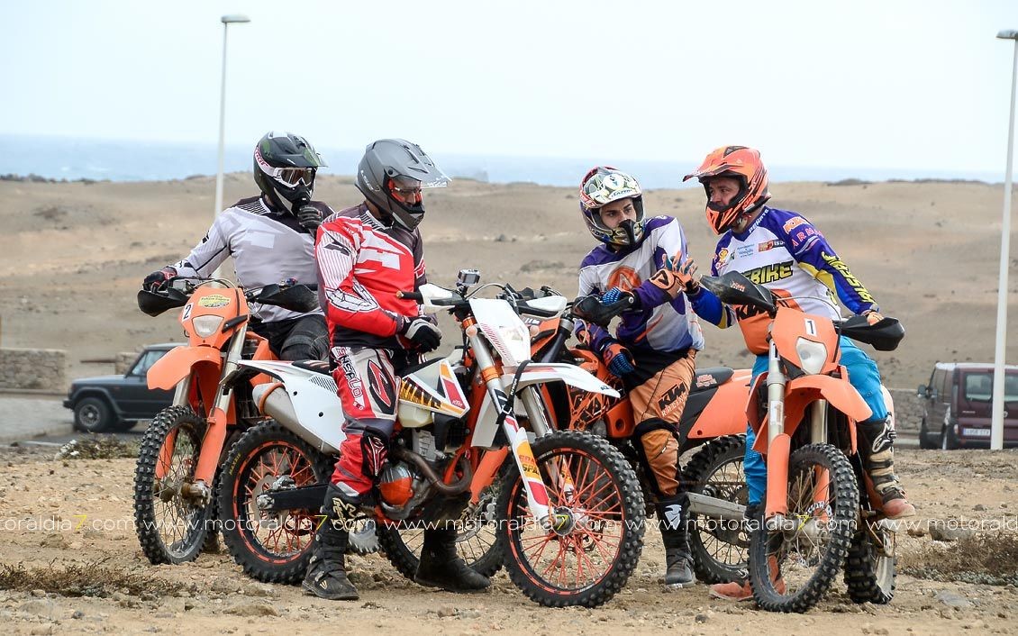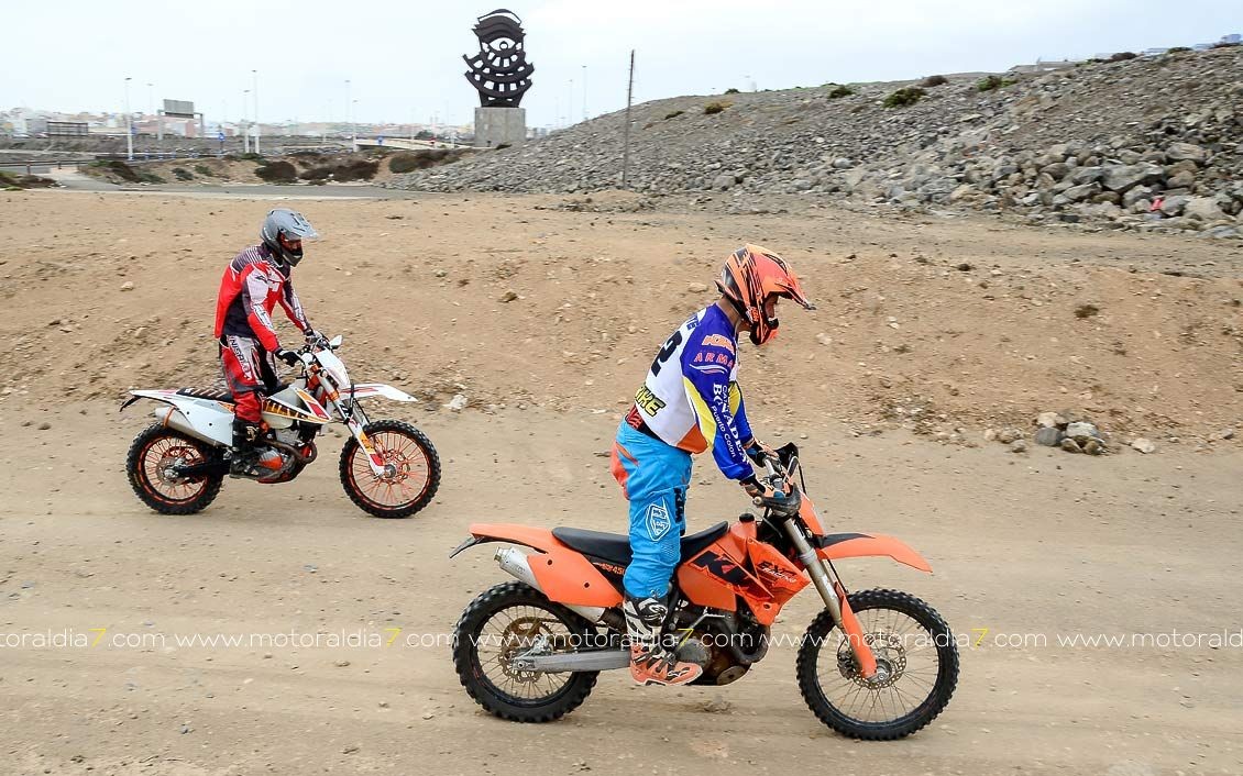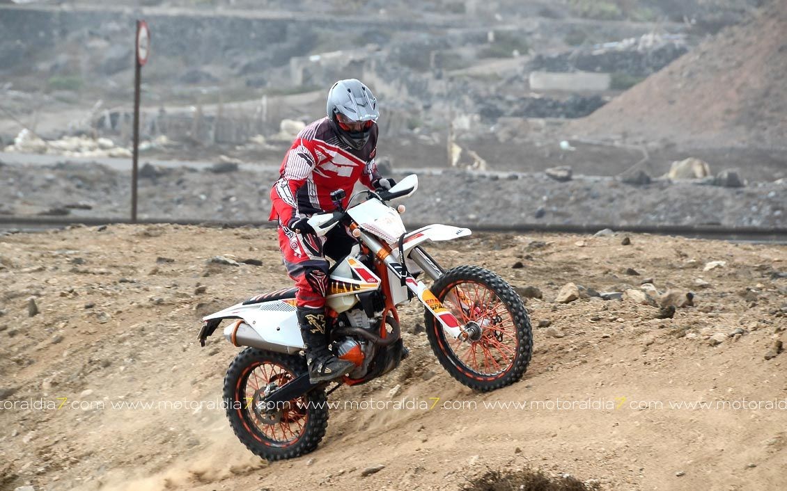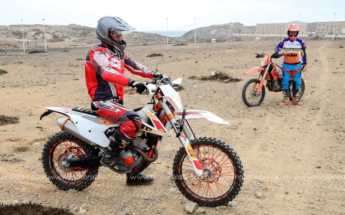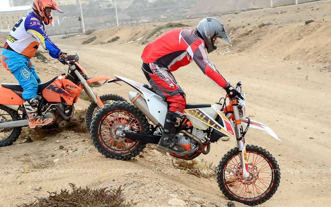 Después de unos cientos de metros, pasamos a la posición de pie (siempre guiados por Pedro Peñate, que vigila nuestras evoluciones). Ahora empieza lo bueno…..de pie sobre ella todo es más difícil, pero nos acordamos de los consejos que nos han dado antes de subirnos, y poco a poco vamos cogiendo confianza y llegando incluso a circular en tercera velocidad. Vamos lentos pero seguros. La KTM 350 Six Day no deja de sorprenderme, y lentamente ella y yo nos vamos haciendo uno. Sobre todo nos cuesta la tarea de subir y bajar marchas con unas botas de enduro que son la primera vez que las usamos, y a las que poco a poco nos vamos también acostumbrando.