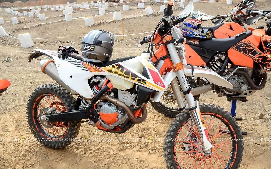 Seguidamente pasamos ya a manos de Pedro Peñate que será el encargado de impartirnos el curso y toda su experiencia en el día de hoy. Ya situados junto a la moto que voy a tener el placer de conducir, una KTM 350 Six Days 2017, Pedro comienza a explicarnos las nociones básicas sobre como situarnos sobre la moto, como sujetarla y sobre todo como conocerla, recalcando que la moto no pesa. La cuestión está en saber jugar con los pesos y la posición de nuestro cuerpo, para conseguir el equilibrio de nuestra moto sin que nos cueste, por mucho que pese realmente. Para demostrarlo, Pedro dejó nuestra moto manteniéndose sola en equilibrio.