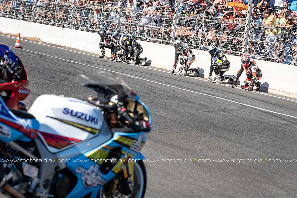 La prueba arrancaba a las 11:30 horas con una salida tipo “Le Mans” en la que los pilotos corren desde el otro lado de la pista hasta sus motos, sujetas por su mecánico de confianza, para poner en marcha el motor, meter primera y salir disparados hacia la primera curva.