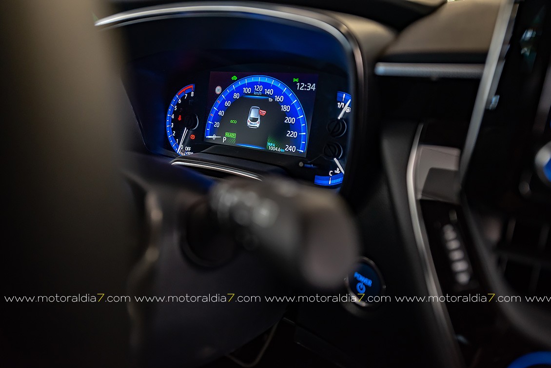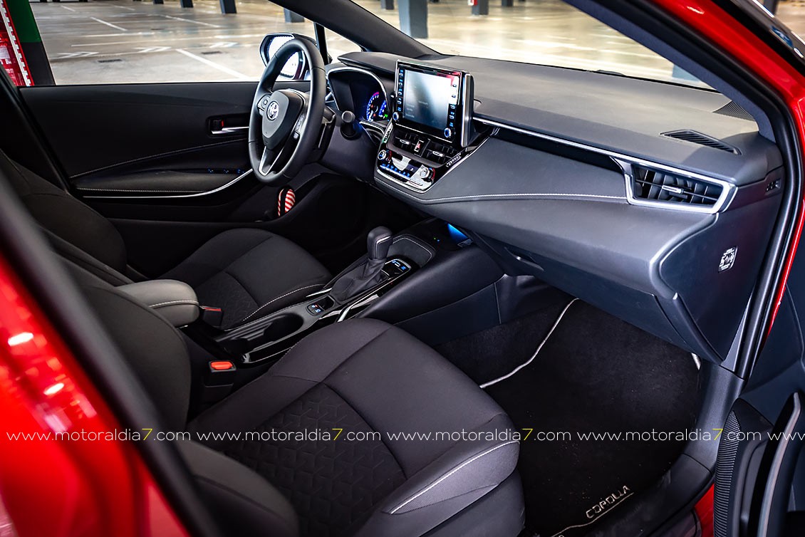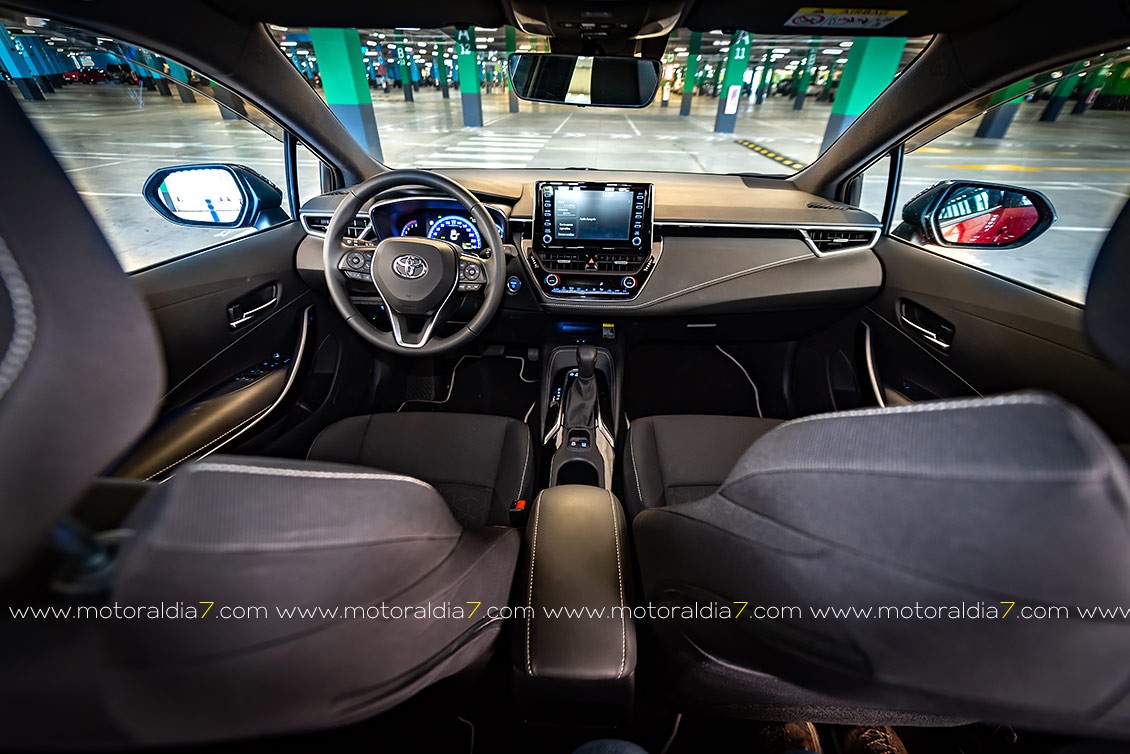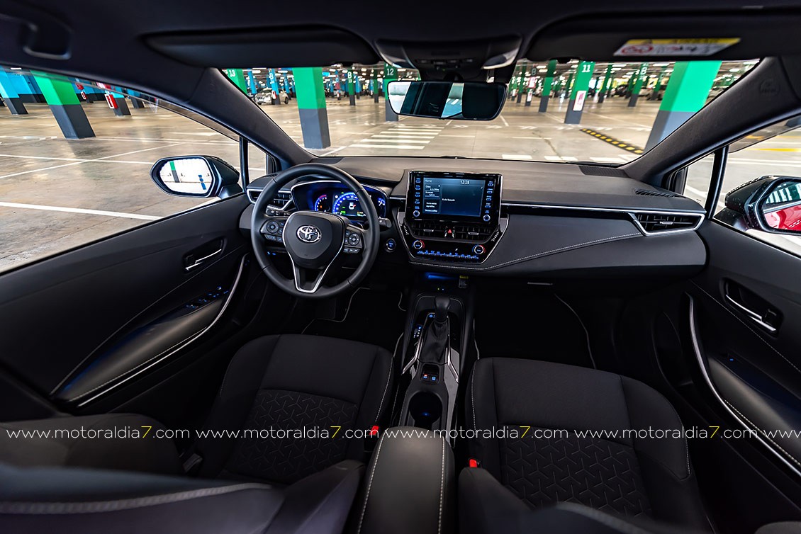 La excelente ergonomía. de la zona del conductor, es lo que remarca el interior del nuevo Corolla gracias a varias cosas, como al nuevo diseño del volante, que cuenta opcionalmente con aro calefactado y una disposición optimizada de los mandos. Una serie de nuevos mandos e instrumentación completan la conexión hombre-máquina —Human Machine Interface (HMI)—. Se trata de un nuevo cuadro de instrumentos con pantalla de 7” completamente digital, una nueva pantalla central multimedia de 8”, un freno de mano eléctrico, una placa para la recarga inalámbrica de teléfonos móviles y un retrovisor electrocromático, rematan el conjunto.