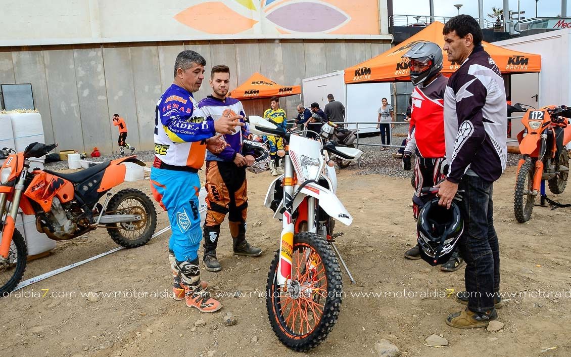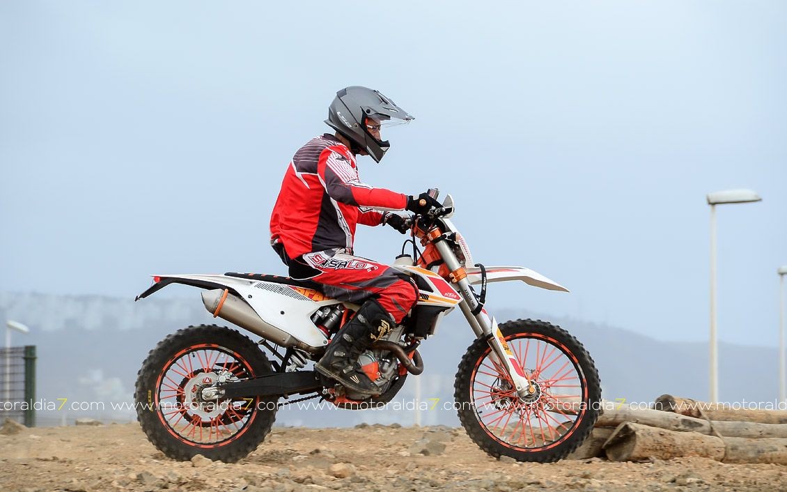 Seguidamente pasamos ya a manos de Pedro Peñate que será el encargado de impartirnos el curso y toda su experiencia en el día de hoy. Ya situados junto a la moto que voy a tener el placer de conducir, una KTM 350 Six Days 2017, Pedro comienza a explicarnos las nociones básicas sobre como situarnos sobre la moto, como sujetarla y sobre todo como conocerla, recalcando que la moto no pesa. La cuestión está en saber jugar con los pesos y la posición de nuestro cuerpo, para conseguir el equilibrio de nuestra moto sin que nos cueste, por mucho que pese realmente. Para demostrarlo, Pedro dejó nuestra moto manteniéndose sola en equilibrio.