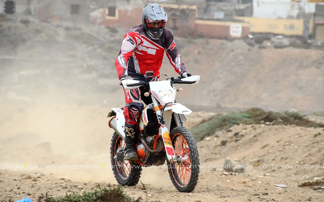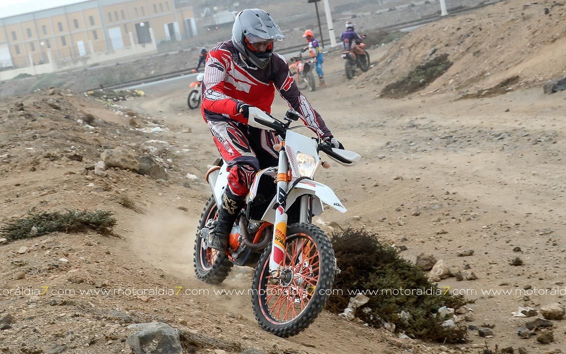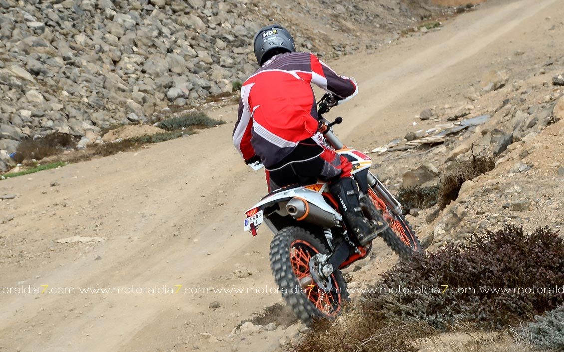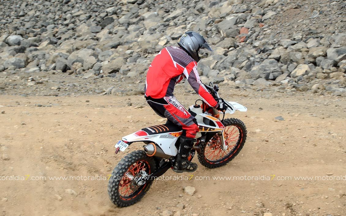 Después de unos cientos de metros, pasamos a la posición de pie (siempre guiados por Pedro Peñate, que vigila nuestras evoluciones). Ahora empieza lo bueno…..de pie sobre ella todo es más difícil, pero nos acordamos de los consejos que nos han dado antes de subirnos, y poco a poco vamos cogiendo confianza y llegando incluso a circular en tercera velocidad. Vamos lentos pero seguros. La KTM 350 Six Day no deja de sorprenderme, y lentamente ella y yo nos vamos haciendo uno. Sobre todo nos cuesta la tarea de subir y bajar marchas con unas botas de enduro que son la primera vez que las usamos, y a las que poco a poco nos vamos también acostumbrando.