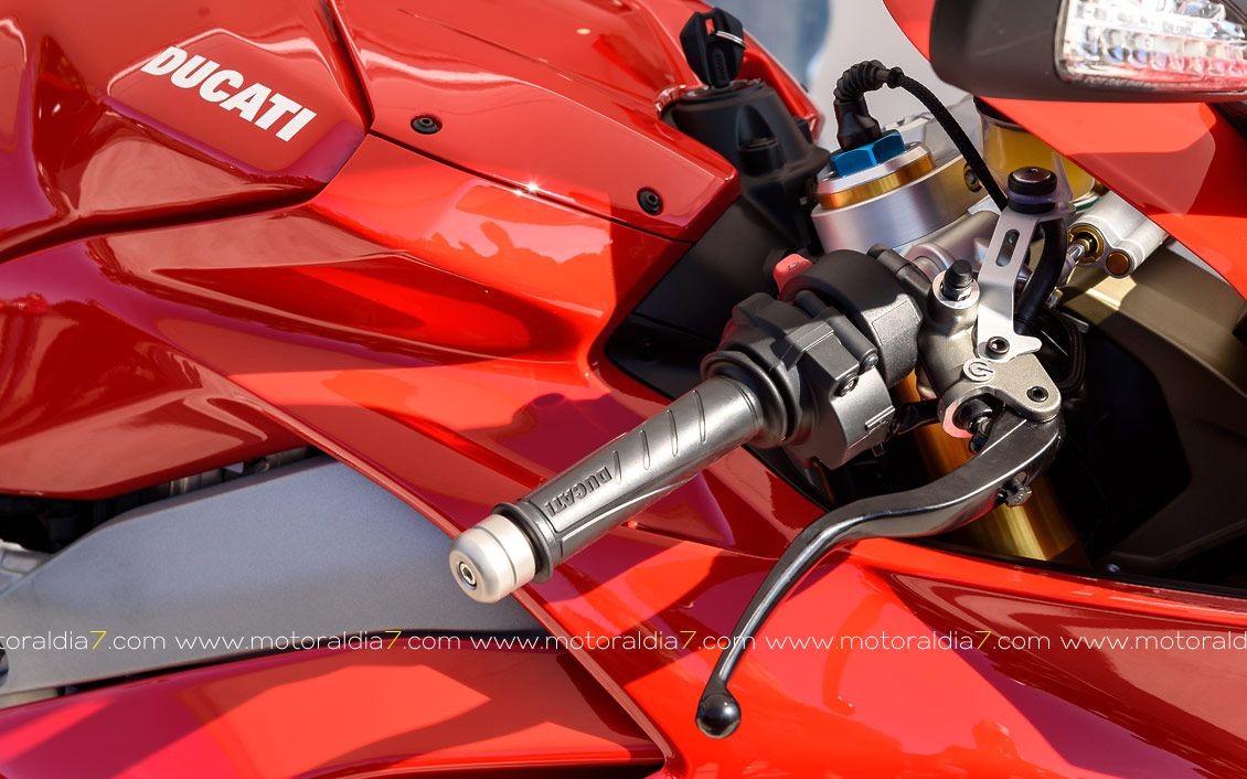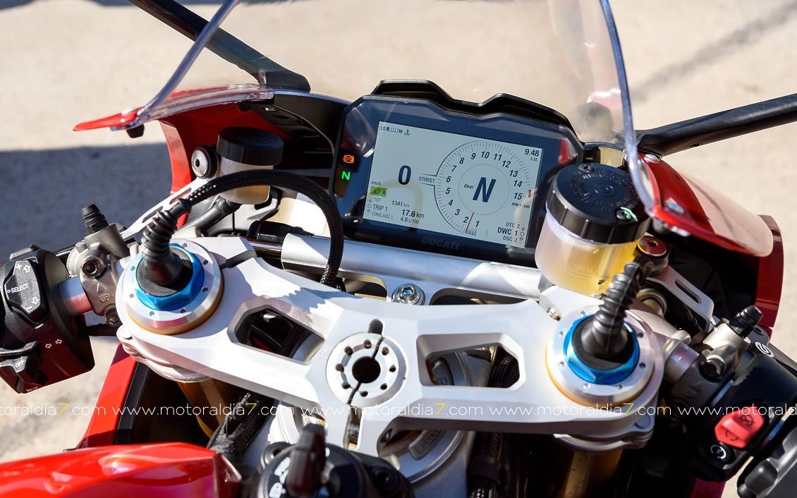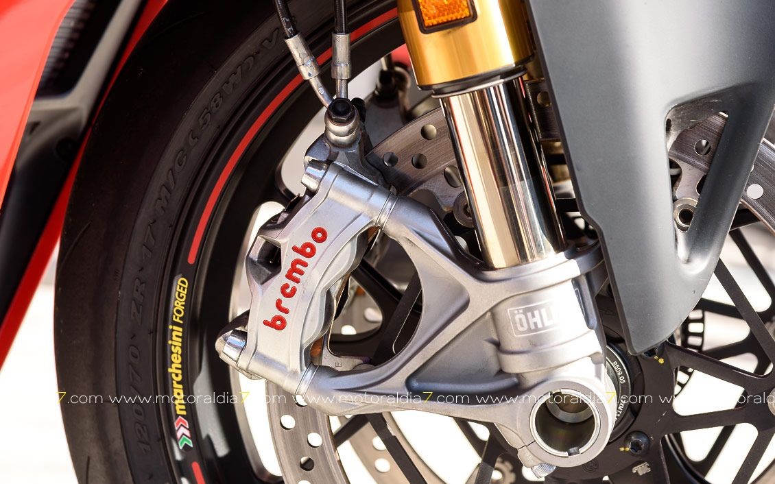 La Panigale V4 S, que es la que teníamos el gusto de conocer, viene equipada con suspensiones Öhlins con la novedad del sistema Smart EC 2.0 que aporta un nuevo interfaz de ajuste, y componentes de primera calidad como las llantas de aluminio forjado Marchesini y batería de ion-lithio, plataforma inercial de Bosch de seis ejes, paquete electrónico de última generación con algunas características nunca vistas hasta ahora.