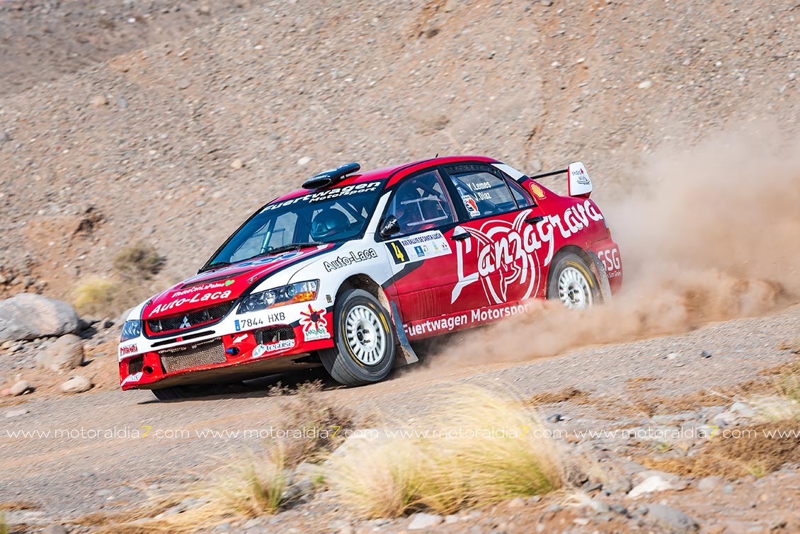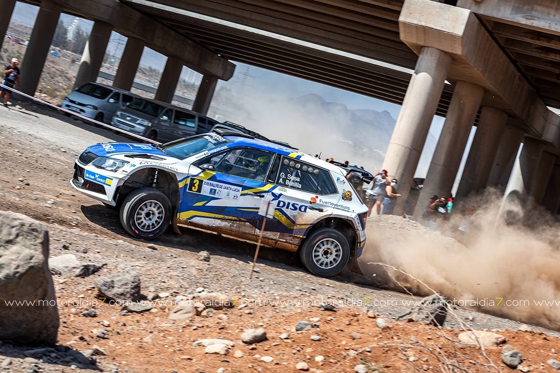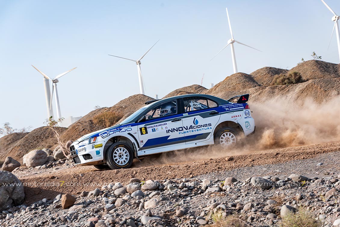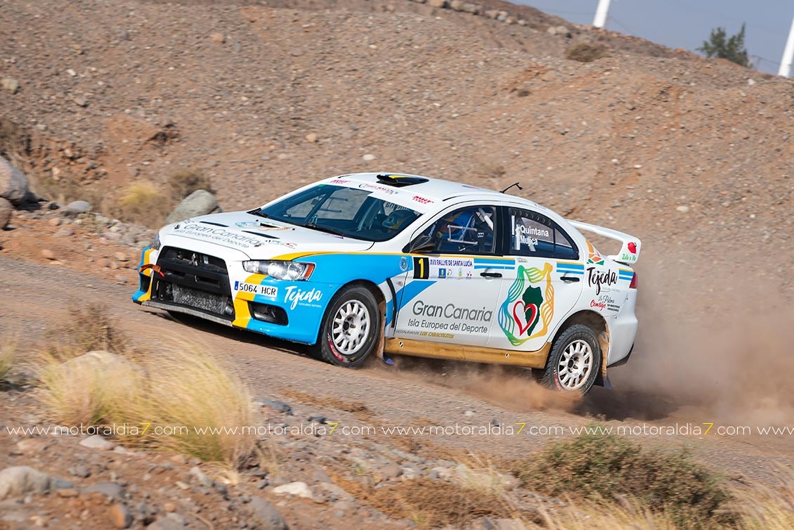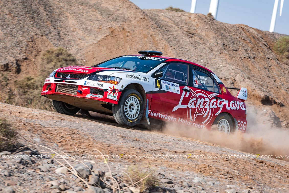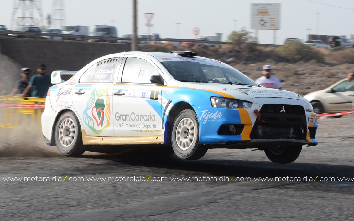 Los primeros líderes del rally fueron Juan Carlos Quintana-Yeray Mujica, que desde el primer tramo imprimieron un ritmo alto, aunque ya el piloto se quejaba de unos extraños en el motor de su Mitsubishi Lancer Evo X. Un problema que fue en aumento y debían retirarse antes de la salida del TC4, tramo donde tomaban el liderato Jesús Tacoronte-Mariola Sáez con su Evo IX, que gracias a su scratch en dicha especial de Juan Grande-Bahía Feliz, pasaban del tercer al primer puesto en la general en ese momento con 7,8 segundos de ventaja sobre Gustavo Sosa-Ariday Bonilla, que venían conservando ganas de correr para preservar la mecánica de su Skoda Fabia R5, mientras Borja Pérez-Jonathan Hernández tomaban el tercer lugar del podio con otro Evo X, pero ya a 42 segundos del nuevo líder.