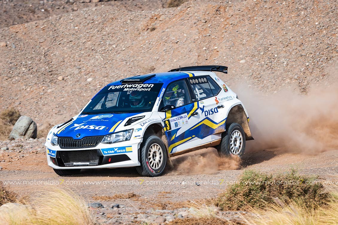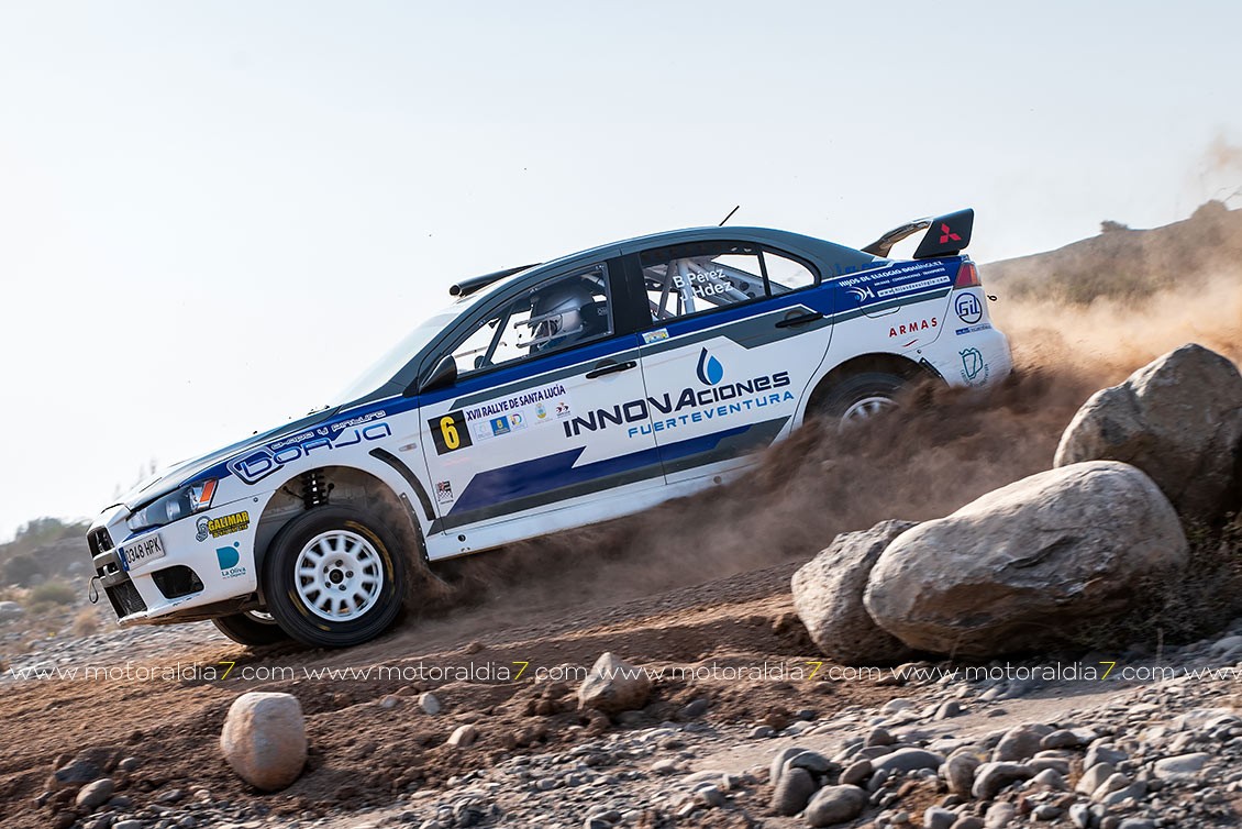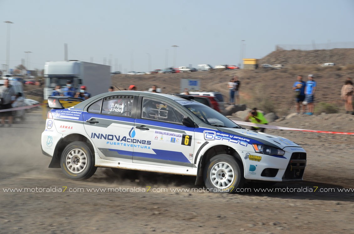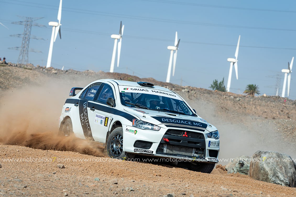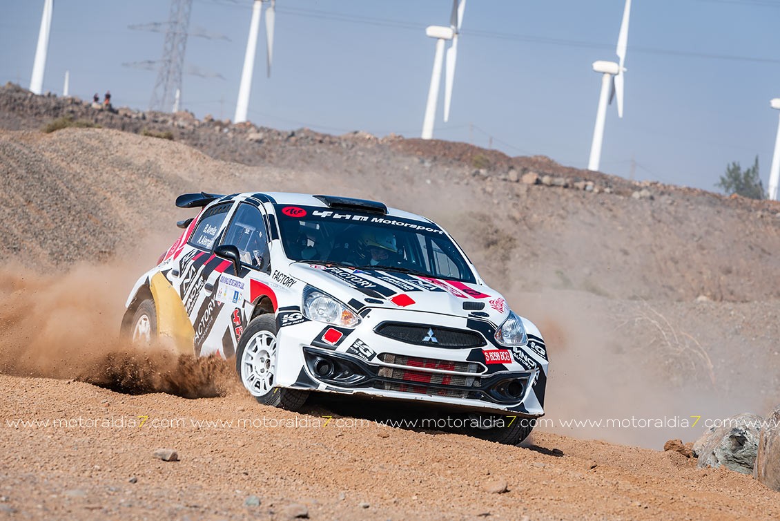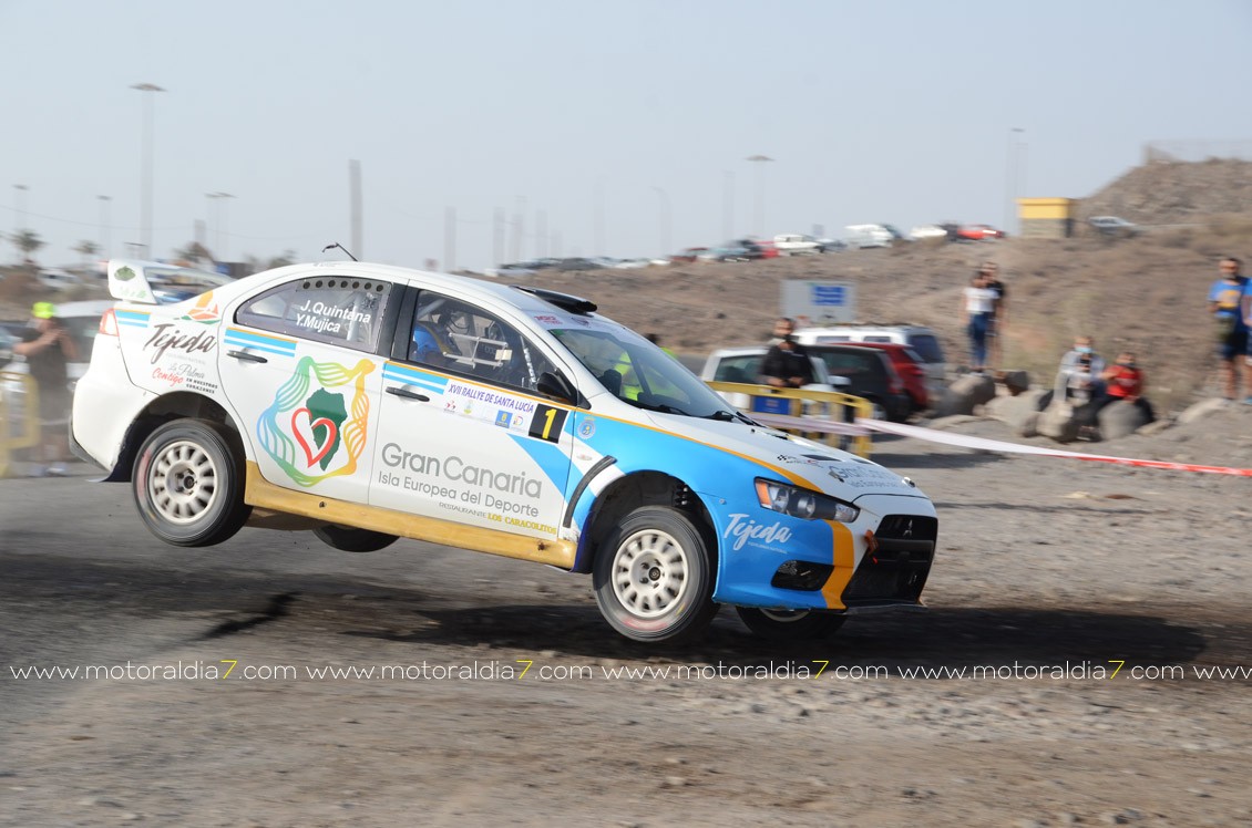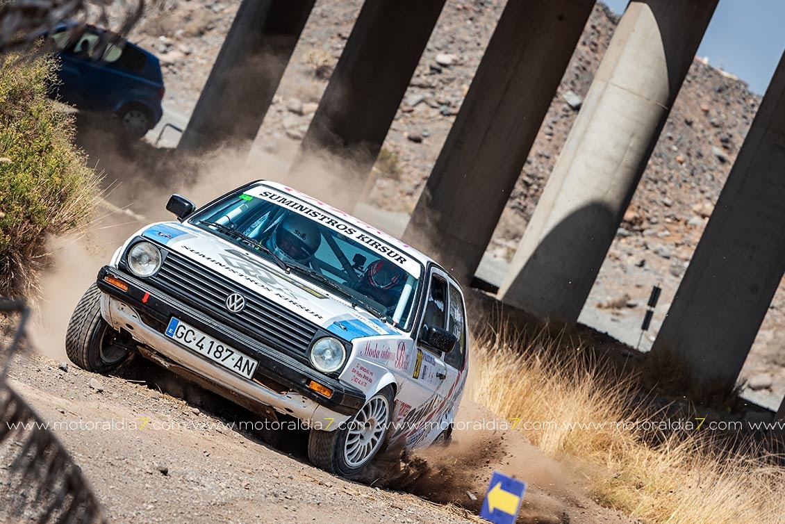 Los primeros líderes del rally fueron Juan Carlos Quintana-Yeray Mujica, que desde el primer tramo imprimieron un ritmo alto, aunque ya el piloto se quejaba de unos extraños en el motor de su Mitsubishi Lancer Evo X. Un problema que fue en aumento y debían retirarse antes de la salida del TC4, tramo donde tomaban el liderato Jesús Tacoronte-Mariola Sáez con su Evo IX, que gracias a su scratch en dicha especial de Juan Grande-Bahía Feliz, pasaban del tercer al primer puesto en la general en ese momento con 7,8 segundos de ventaja sobre Gustavo Sosa-Ariday Bonilla, que venían conservando ganas de correr para preservar la mecánica de su Skoda Fabia R5, mientras Borja Pérez-Jonathan Hernández tomaban el tercer lugar del podio con otro Evo X, pero ya a 42 segundos del nuevo líder.