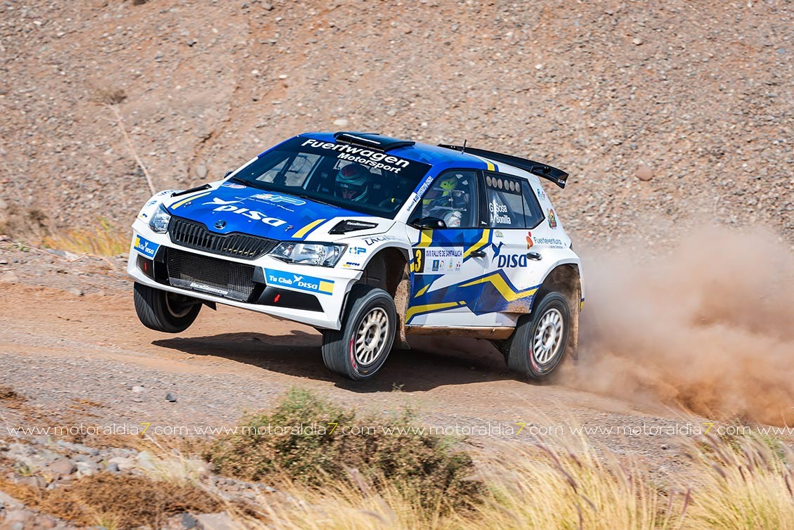 La segunda posición final ha sido para Gustavo Sosa-Ariday Bonilla (Skoda Fabia R5), que se mantuvieron en la segunda plaza a lo largo de casi toda la prueba, hasta que decidieron apretar en los dos tramos finales, reduciendo la ventaja de Tacoronte a sólo 1,3 segundos a falta de dos tramos. Lo dieron todo y se lanzaron a tope, pero con la mala suerte de cometer el único fallo de la jornada al pinchar en la rueda trasera derecha en el TC7, lo que impidió su posible scratch. Tacoronte no estaba ajeno al empuje de su rival y no se lo puso nada fácil: También imprimía más brío a su pilotaje y se hacía con el mejor crono del TC6 y cedían solamente 0,4 segundos en el último TC, cosechando la segunda victoria consecutiva en el rallye de tierra grancanario.